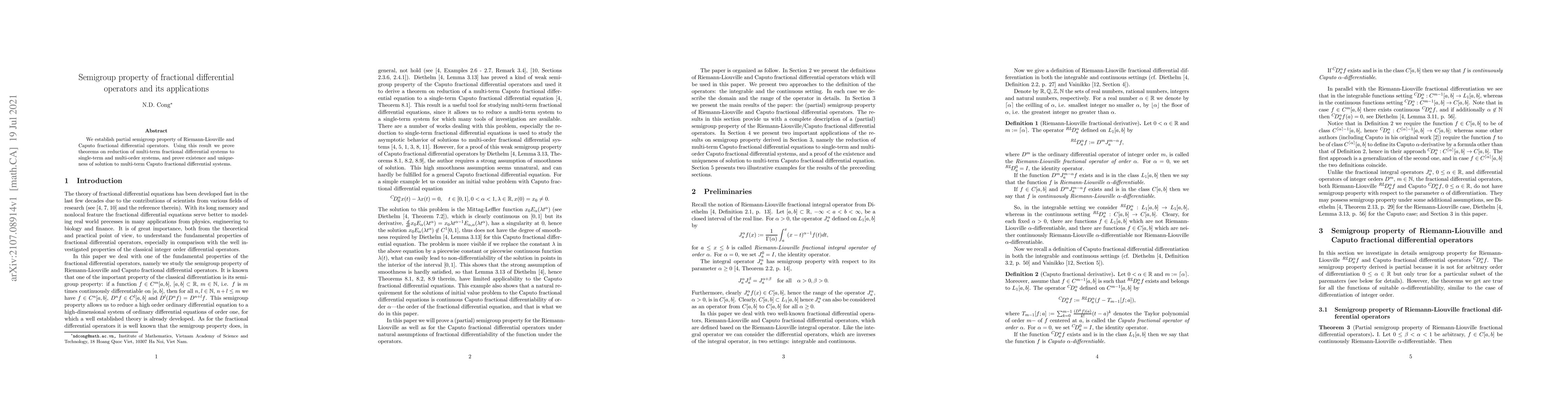 Summary: This paper establishes the partial semigroup property for Riemann-Liouville and Caputo fractional differential operators, leading to theorems that reduce multi-term fractional differential systems to simpler forms, and proves existence and uniqueness of solutions for multi-term Caputo systems.