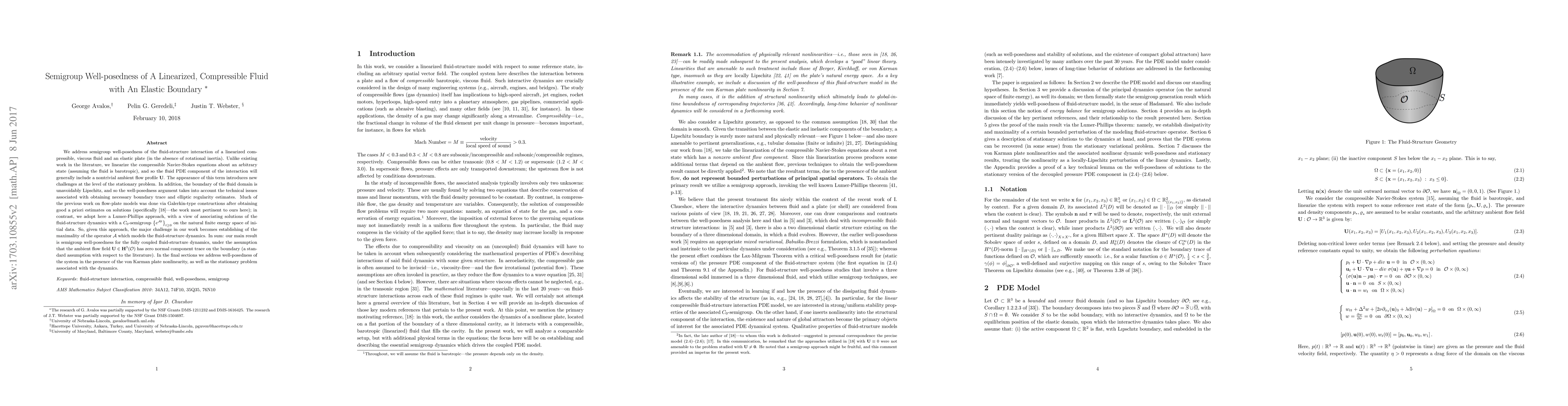 We address semigroup well-posedness of the fluid-structure interaction of a linearized compressible, viscous fluid and an elastic plate (in the absence of rotational inertia). Unlike existing work in the literature, we linearize the compressible Navier-Stokes equations about an arbitrary state (assuming the fluid is barotropic), and so the fluid PDE component of the interaction will generally include a nontrivial ambient flow profile $ \mathbf{U}$. The appearance of this term introduces new challenges at the level of the stationary problem. In addition, the boundary of the fluid domain is unavoidably Lipschitz, and so the well-posedness argument takes into account the technical issues associated with obtaining necessary boundary trace and elliptic regularity estimates. Much of the previous work on flow-plate models was done via Galerkin-type constructions after obtaining good a priori estimates on solutions (specifically \cite {Chu2013-comp}---the work most pertinent to ours here); in contrast, we adopt here a Lumer-Phillips approach, with a view of associating solutions of the fluid-structure dynamics with a $C_{0}$-semigroup $\left\{ e^{ \mathcal{A}t}\right\} _{t\geq 0}$ on the natural finite energy space of initial data. So, given this approach, the major challenge in our work becomes establishing of the maximality of the operator $\mathcal{A}$ which models the fluid-structure dynamics. In sum: our main result is semigroup well-posedness for the fully coupled fluid-structure dynamics, under the assumption that the ambient flow field $ \mathbf{U}\in \mathbf{H}^{3}(\mathcal{O})$ has zero normal component trace on the boundary (a standard assumption with respect to the literature). In the final sections we address well-posedness of the system in the presence of the von Karman plate nonlinearity, as well as the stationary problem associated with the dynamics.