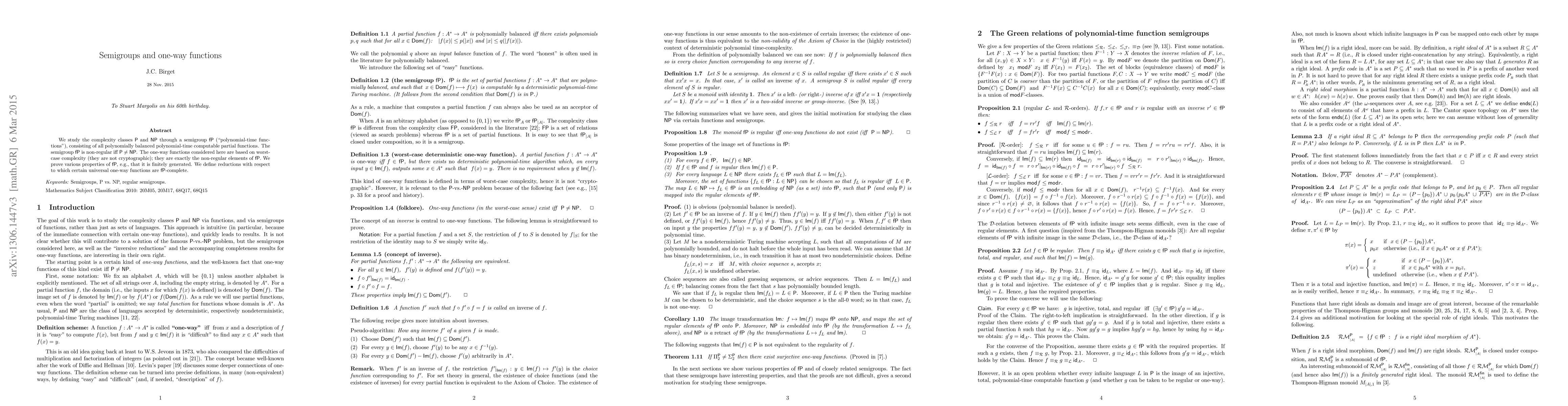 This paper explores the complexity classes P and NP via the semigroup fP of polynomial-time computable partial functions, proving that P ≠ NP if fP is non-regular. It also investigates one-way functions within fP, establishing their properties and demonstrating their fP-completeness under certain reductions.