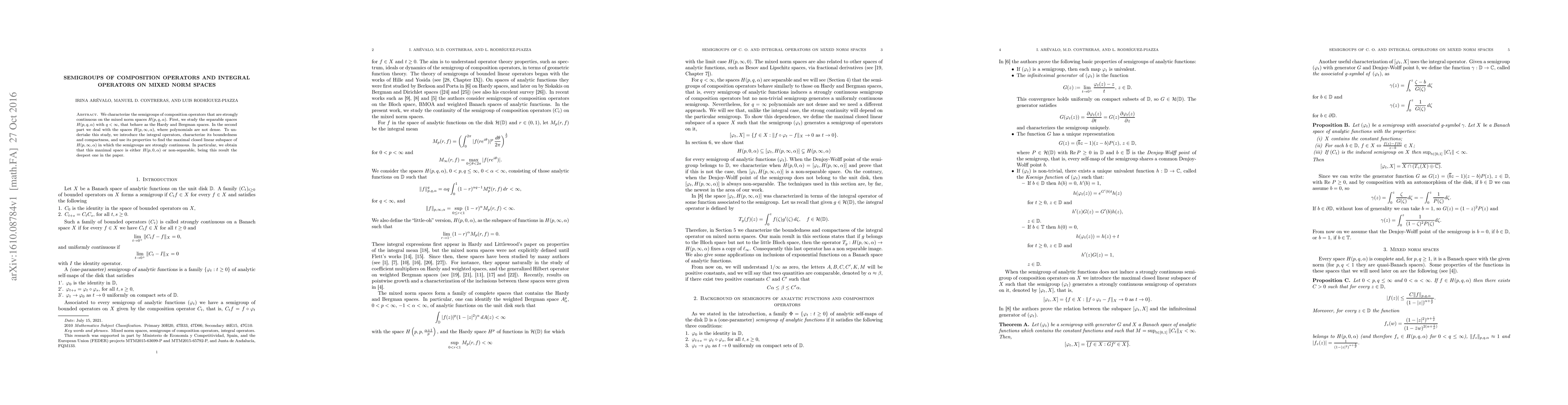 We characterize the semigroups of composition operators that are strongly continuous on the mixed norm spaces $H(p,q,\alpha)$. First, we study the separable spaces $H(p,q,\alpha)$ with $q<\infty,$ that behave as the Hardy and Bergman spaces. In the second part we deal with the spaces $H(p,\infty,\alpha),$ where polynomials are not dense. To undertake this study, we introduce the integral operators, characterize its boundedness and compactness, and use its properties to find the maximal closed linear subspace of $H(p,\infty,\alpha)$ in which the semigroups are strongly continuous. In particular, we obtain that this maximal space is either $H(p,0,\alpha)$ or non-separable, being this result the deepest one in the paper.