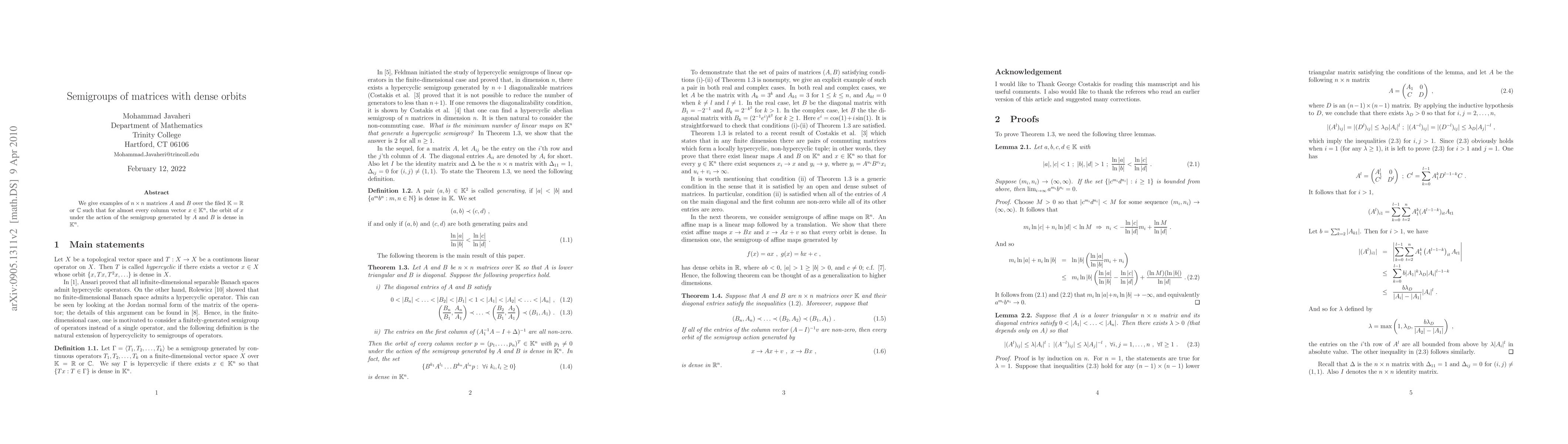 We give examples of $n \times n$ matrices $A$ and $B$ over the filed $\mathbb{K}=\mathbb{R}$ or $\mathbb{C}$ such that for almost every column vector $x \in \mathbb{K}^n$, the orbit of $x$ under the action of the semigroup generated by $A$ and $B$ is dense in $\mathbb{K}^n$.