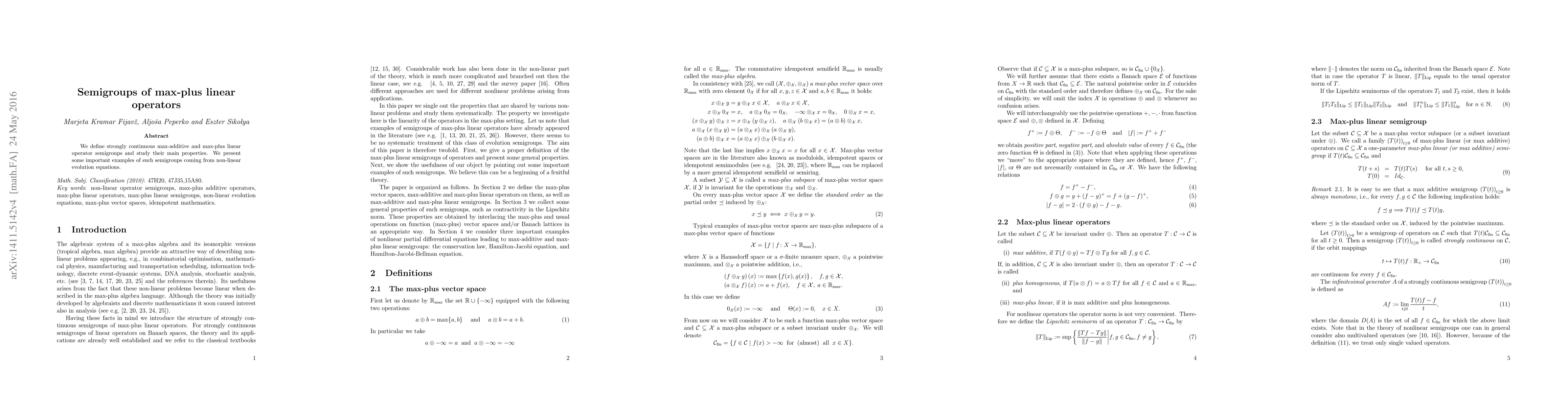 This paper introduces max-plus linear operator semigroups with key properties, providing examples from non-linear evolution equations. It explores the main characteristics of these semigroups, offering new insights into their behavior and applications.