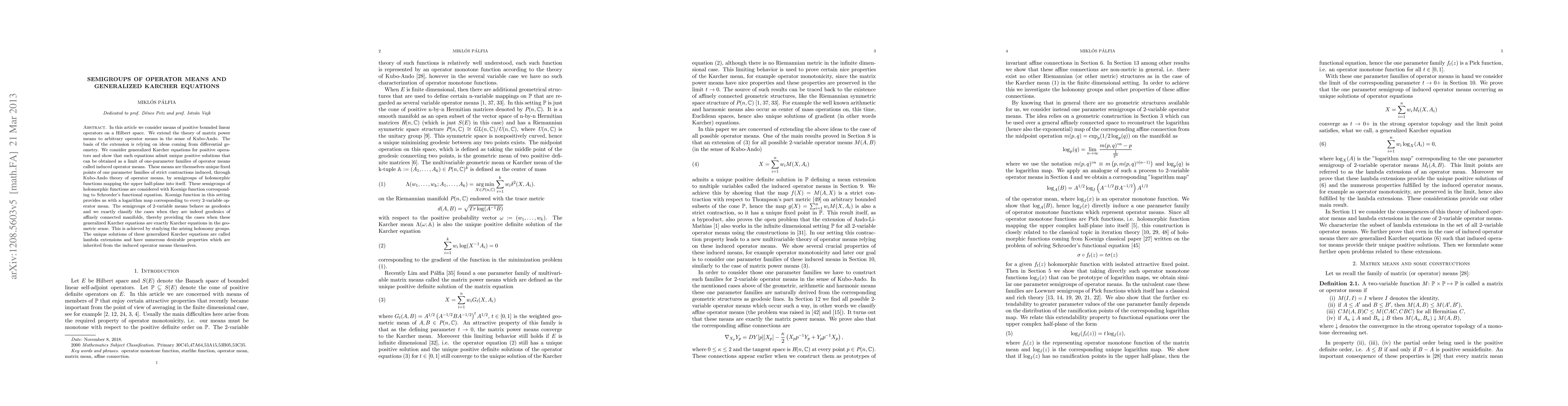 In this article we consider means of positive operators on a Hilbert space. We extend the theory of matrix power means to arbitrary operator means in the sense of Kubo-Ando. The basis of the extension is relying on ideas coming from differential geometry. We consider generalized Karcher equations for positive operators and show that such equations admit unique positive solutions that can be obtained as a limit of one-parameter families of operator means called induced operator means. These means are themselves unique fixed points of one parameter families of strict contractions induced, through Kubo-Ando theory of operator means, by semigroups of holomorphic functions mapping the upper half-plane into itself. These semigroups of holomorphic functions are considered with Koenigs function corresponding to Schroeder's functional equation. Koenigs function in this setting provides us with a logarithm map corresponding to every 2-variable operator mean. The semigroups of 2-variable means behave as geodesics and we exactly classify the cases when they are indeed geodesics of affinely connected manifolds, thereby providing the cases when these generalized Karcher equations are exactly Karcher equations in the geometric sense. This is achieved by studying the arising holonomy groups. The unique solutions of these generalized Karcher equations are called lambda extensions and have numerous desirable properties which are inherited from the induced operator means themselves.