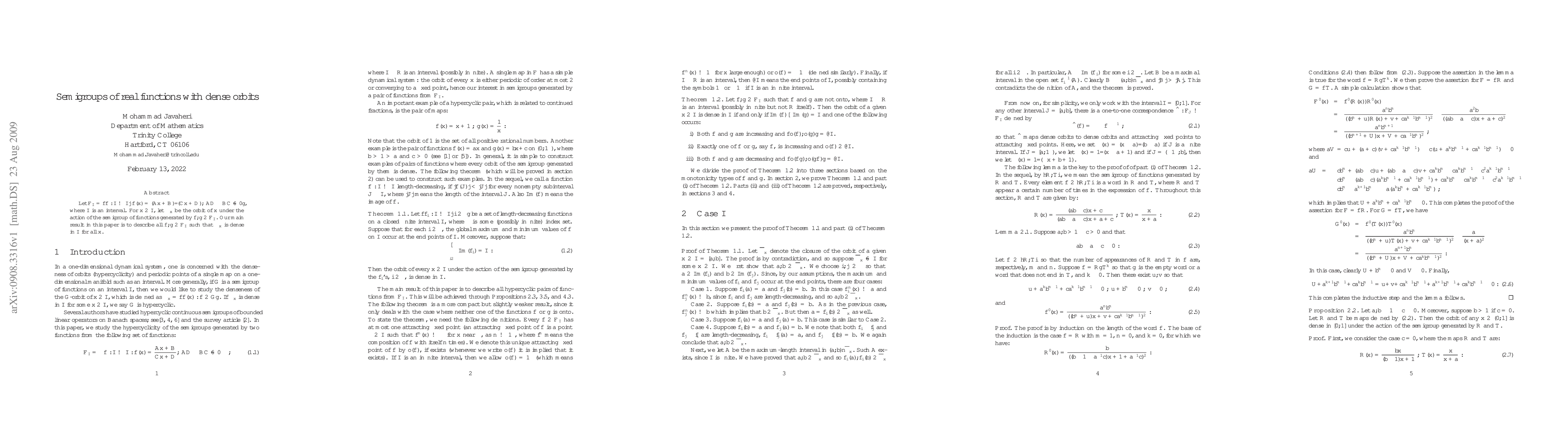 Let ${\mathcal F}_I=\{f:I \to I| f(x)= (Ax+B)/(Cx+D); AD-BC \neq 0 \}$, where $I$ is an interval. For $x\in I$, let ${\Omega}_x$ be the orbit of $x$ under the action of the semigroup of functions generated by $f,g \in {\mathcal F}_I$. Our main result in this paper is to describe all $f,g \in {\mathcal F}_I$ such that $\Omega_x$ is dense in $I$ for all $x$.