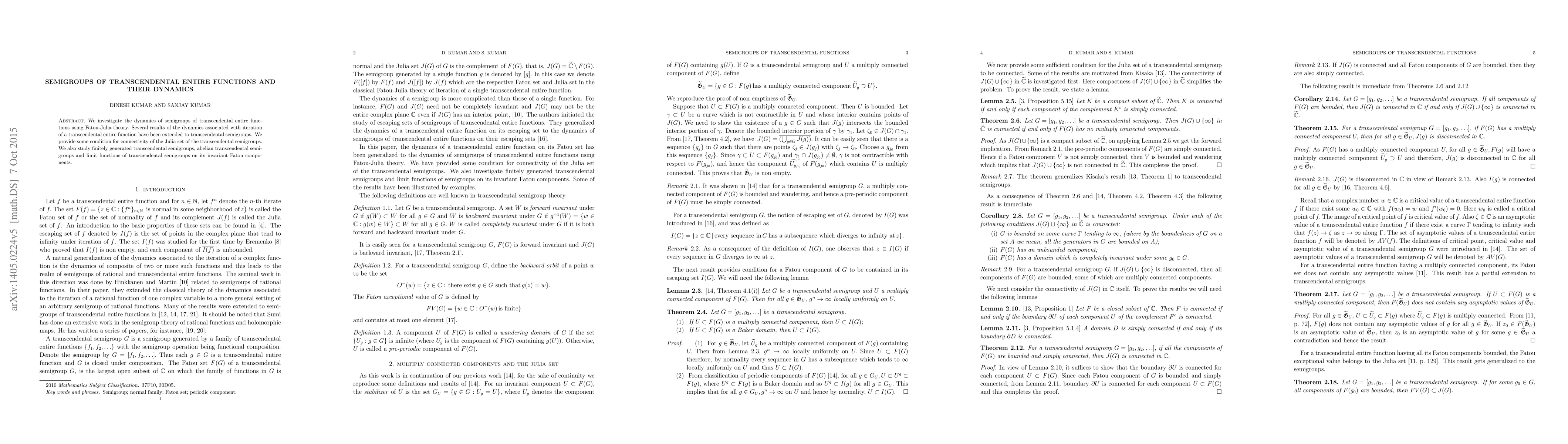 This paper explores the dynamics of semigroups composed of transcendental entire functions, applying Fatou-Julia theory to extend known results. It provides conditions for the connectivity of the Julia set and examines finitely generated and abelian transcendental semigroups, along with their limit functions on invariant Fatou components.