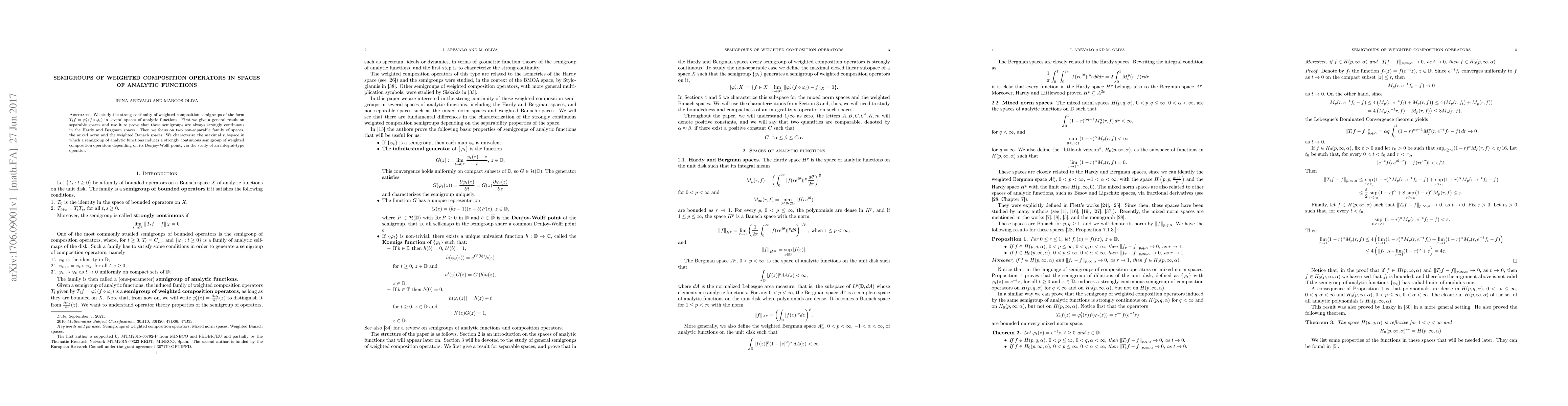 This paper investigates the strong continuity of weighted composition semigroups in various analytic function spaces, proving strong continuity in Hardy and Bergman spaces, and characterizing maximal subspaces for non-separable spaces through the Denjoy-Wolff point and an integral-type operator.