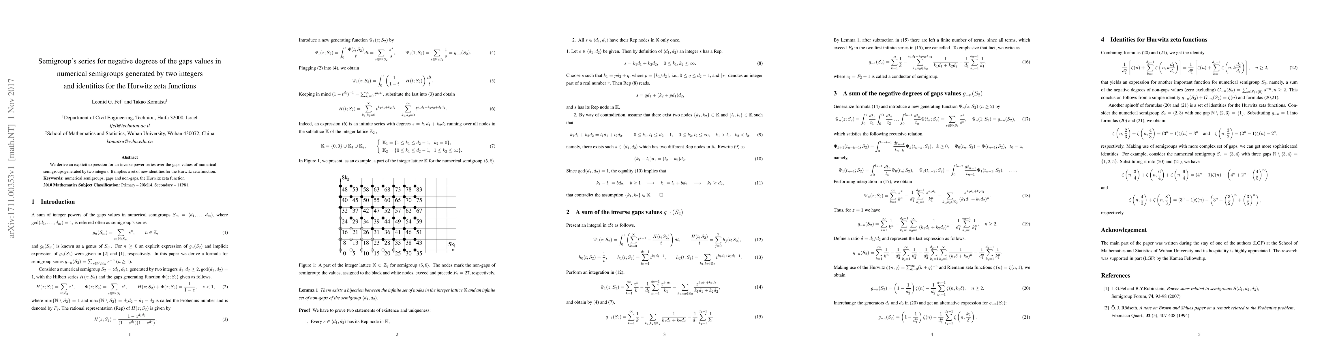 We derive an explicit expression for an inverse power series over the gaps values of numerical semigroups generated by two integers. It implies a set of new identities for the Hurwitz zeta function.
