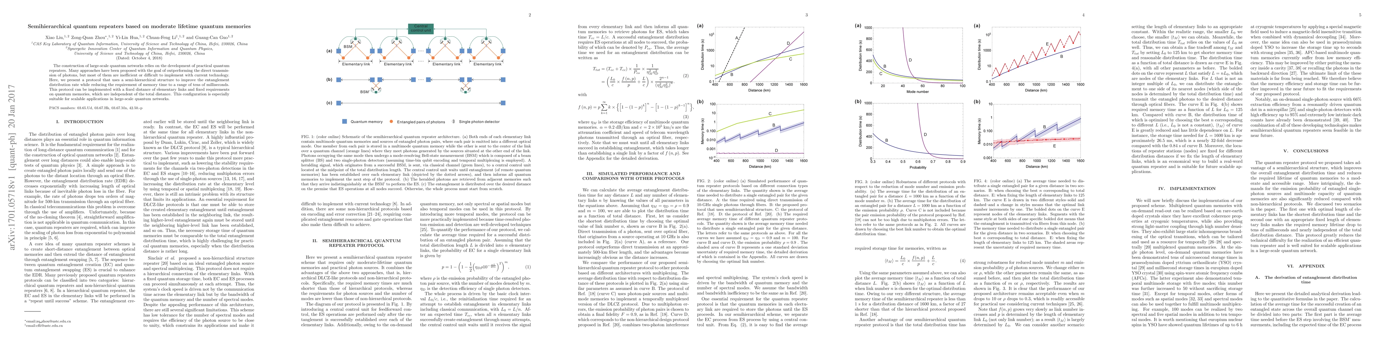 The construction of large-scale quantum networks relies on the development of practical quantum repeaters. Many approaches have been proposed with the goal of outperforming the direct transmission of photons, but most of them are inefficient or difficult to implement with current technology. Here, we present a protocol that uses a semi-hierarchical structure to improve the entanglement distribution rate while reducing the requirement of memory time to a range of tens of milliseconds. This protocol can be implemented with a fixed distance of elementary links and fixed requirements on quantum memories, which are independent of the total distance. This configuration is especially suitable for scalable applications in large-scale quantum networks.