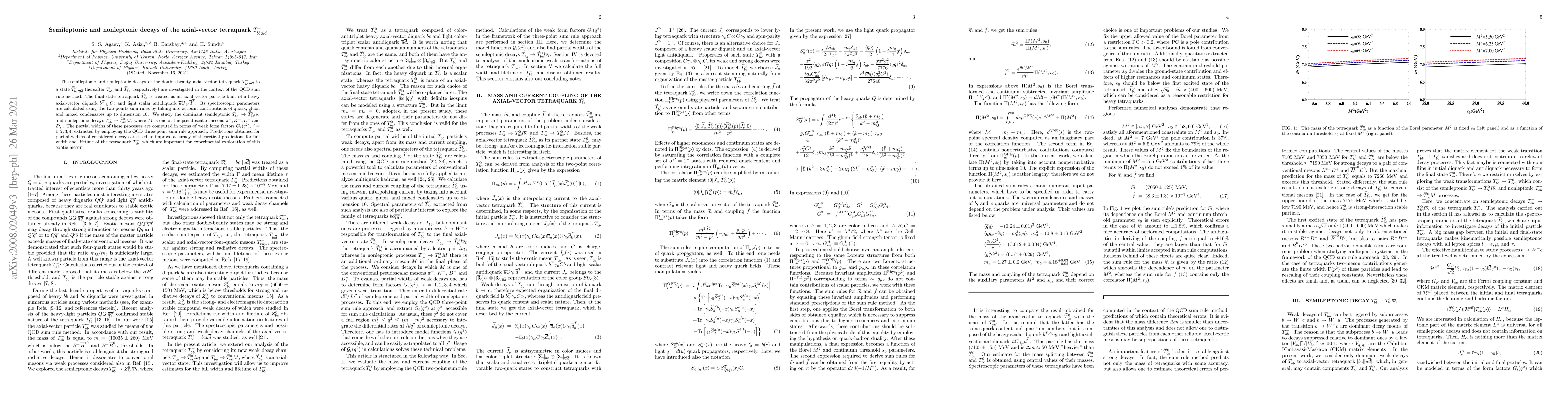 This paper investigates the semileptonic and nonleptonic decays of the axial-vector tetraquark $T_{bb;\overline{u} \overline{d}}^{-}$ using the QCD sum rule method, calculating its spectroscopic parameters and predicting the partial widths for its decay into $\widetilde{T}_{bc}^{0}$ and various pseudoscalar mesons. The results aim to enhance theoretical predictions for the full width and lifetime of the tetraquark, aiding experimental searches.