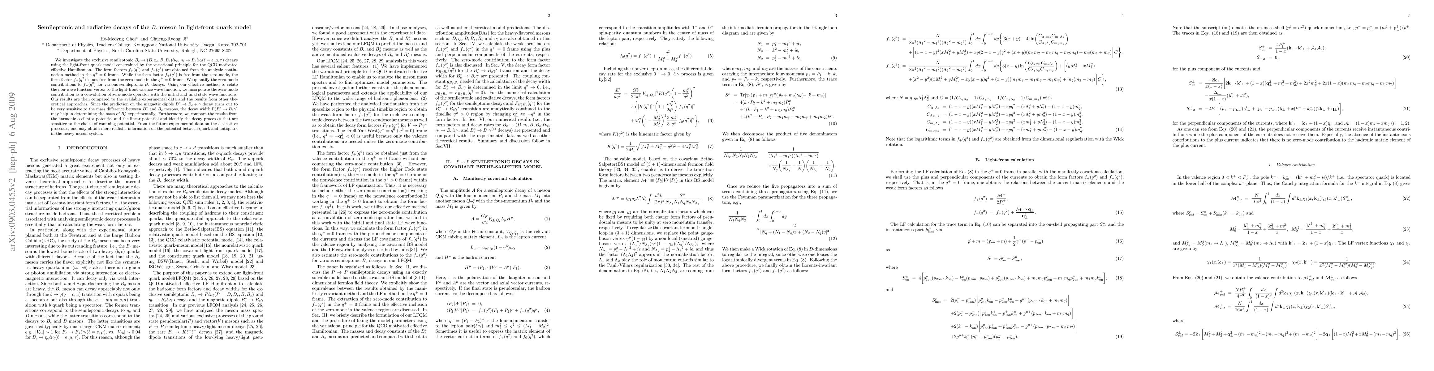 This paper studies semileptonic and radiative decays of the B_c meson using the light-front quark model, focusing on the form factors and zero-mode contributions. It predicts the decay width for the magnetic dipole decay $B^*_c\to B_c+\gamma$, suggesting it could help determine the mass of $B^*_c$ meson. The study also compares results from different confining potentials to identify decay processes sensitive to the choice of potential.