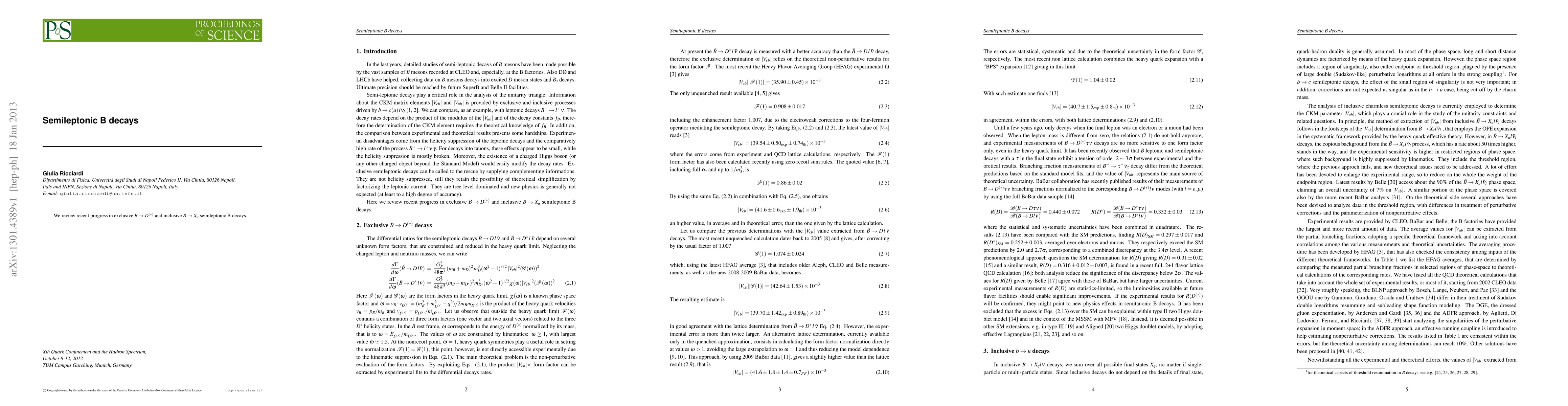 Summary: This paper reviews recent advancements in the study of exclusive B decays to D^(*) and inclusive B decays to X(u), focusing on semileptonic processes involving leptons and their implications for understanding fundamental particle interactions.