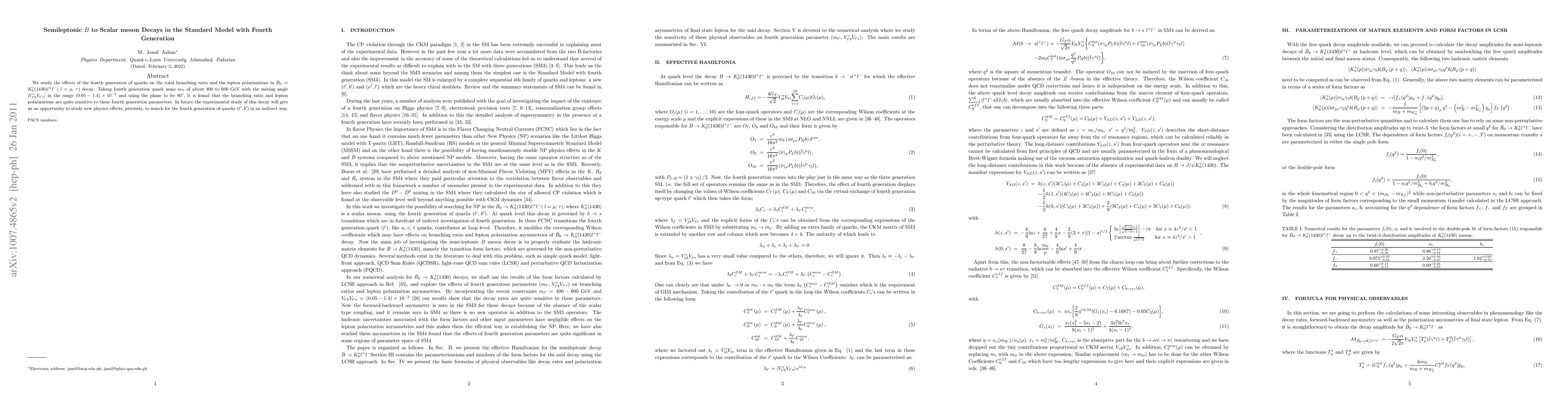 This paper investigates the impact of a fourth generation of quarks on the decay $\bar{B}_{0}\rightarrow K_{0}^{\ast}(1430)l^{+}l^{-}$ within the Standard Model, finding that the branching ratio and lepton polarizations are highly sensitive to fourth generation parameters. Future experimental studies of this decay could provide insights into the existence of fourth generation quarks.