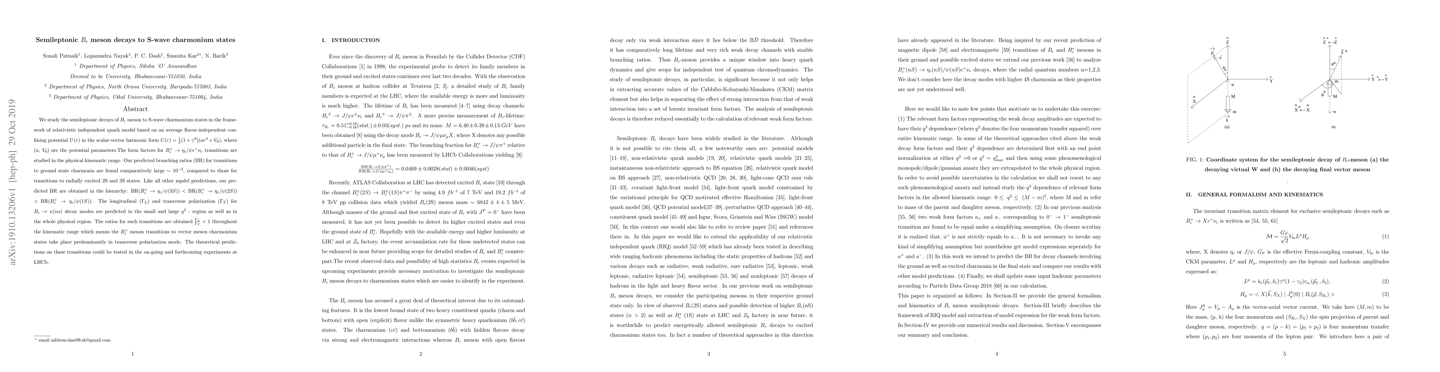 This paper investigates the semileptonic decay of $B_c$ mesons to S-wave charmonium states using a relativistic independent quark model. Predicted branching ratios for transitions to ground state charmonia are significantly larger than those for excited states, with the hierarchy BR($B_c^+\to \eta_c/\psi (1S)$) > BR($B_c^+\to \eta_c/\psi (2S)$) > BR($B_c^+\to \eta_c/\psi (3S)$). The study also predicts polarization modes for these decays, finding predominantly transverse polarization.