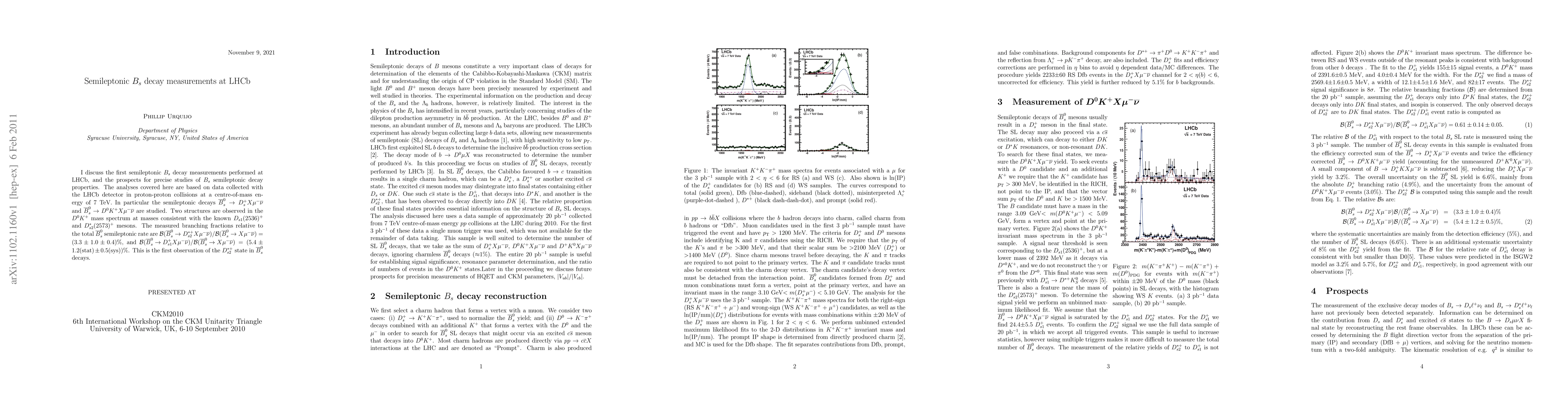 I discuss the first semileptonic $B_s$ decay measurements performed at LHCb, and the prospects for precise studies of $B_s$ semileptonic decay properties. The analyses covered here are based on data collected with the LHCb detector in proton-proton collisions at a centre-of-mass energy of 7 TeV. In particular the semileptonic decays $\Bs\to D_s^+ X \munu$ and $\Bs\to D^0K^+ X \munu$ are studied. Two structures are observed in the $D^0K^+$ mass spectrum at masses consistent with the known $D_{s1}(2536)^+$ and $D^*_{s2}(2573)^{+}$ mesons. The measured branching fractions relative to the total $\Bs$ semileptonic rate are ${{\cal{B}}(\Bs\to D_{s2}^{*+} X \munu)}/{{\cal{B}}(\Bs\to X \munu)}= (3.3\pm 1.0\pm 0.4)%$, and ${{\cal{B}}(\Bs\to D_{s1}^+ X \munu)}/{{\cal{B}}(\Bs\to X \munu)}= (5.4\pm 1.2({\rm stat})\pm 0.5({\rm sys}))%$. This is the first observation of the $D_{s2}^{*+}$ state in $\Bs$ decays.
