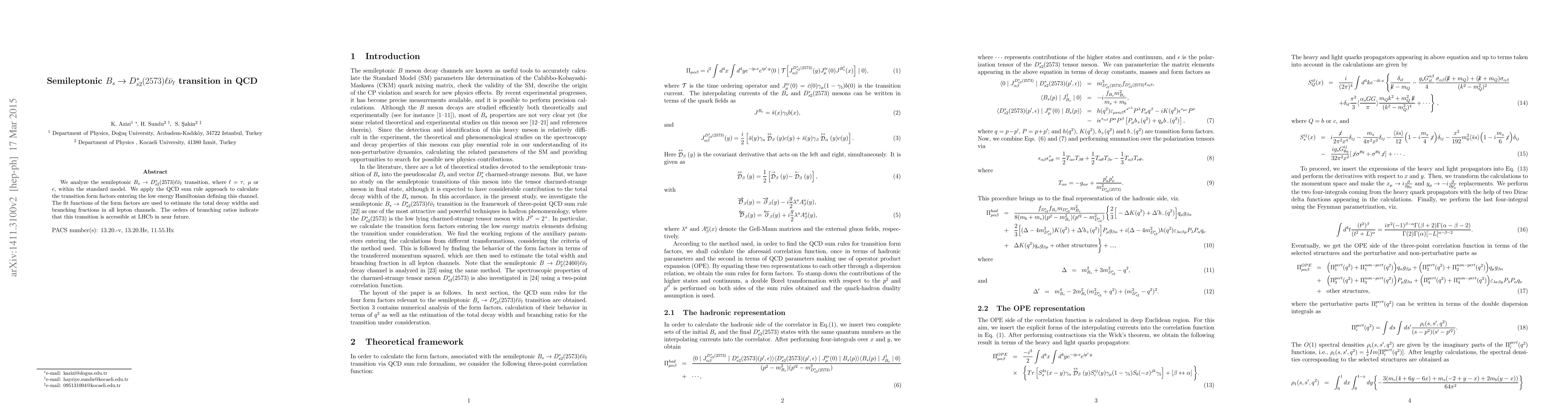 This paper investigates the semileptonic $B_{s} \rightarrow D_{s2}^{*}(2573)\ell\bar{\nu}_{\ell}$ transition using QCD sum rules to calculate form factors, and estimates the decay widths and branching fractions, suggesting the process is detectable at LHCb.