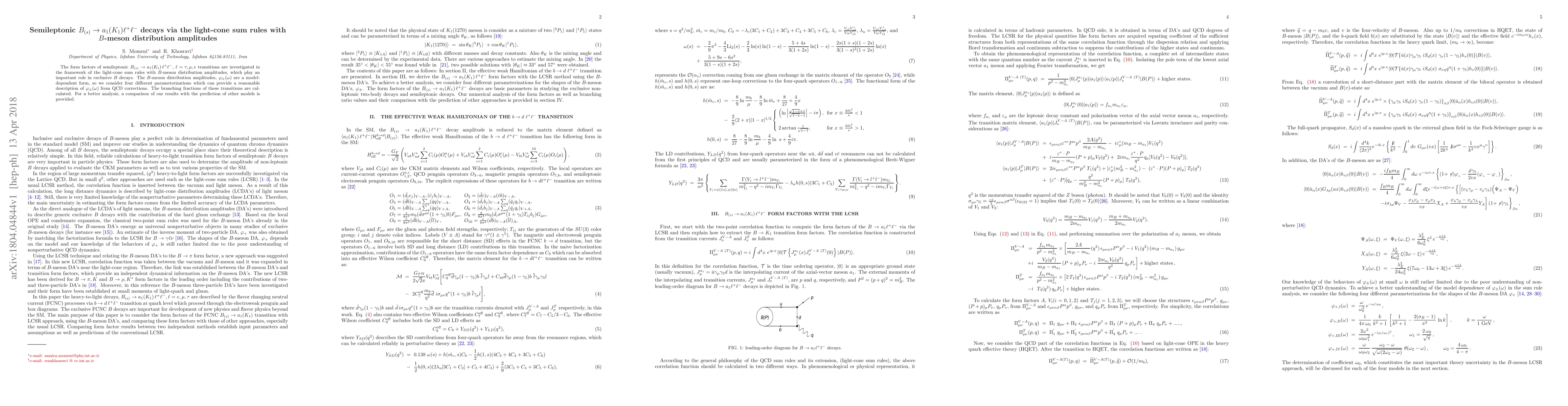 This paper investigates the form factors of semileptonic $B_{(s)}\to a_1(K_1)\ell^+\ell^-$ decays using light-cone sum rules and $B$-meson distribution amplitudes. The study considers four different parameterizations for these amplitudes and calculates the branching fractions, comparing results with other models for validation.