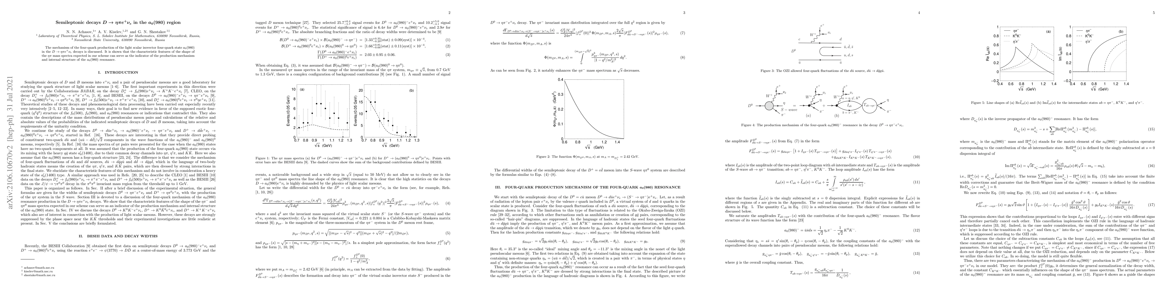 The mechanism of the four-quark production of the light scalar isovector four-quark state $a_0(980)$ in the $D\to\eta\pi e^+\nu_e$ decays is discussed. It is shown that the characteristic features of the shape of the $\eta\pi$ mass spectra expected in our scheme can serve as the indicator of the production mechanism and internal structure of the $a_0(980)$ resonance.