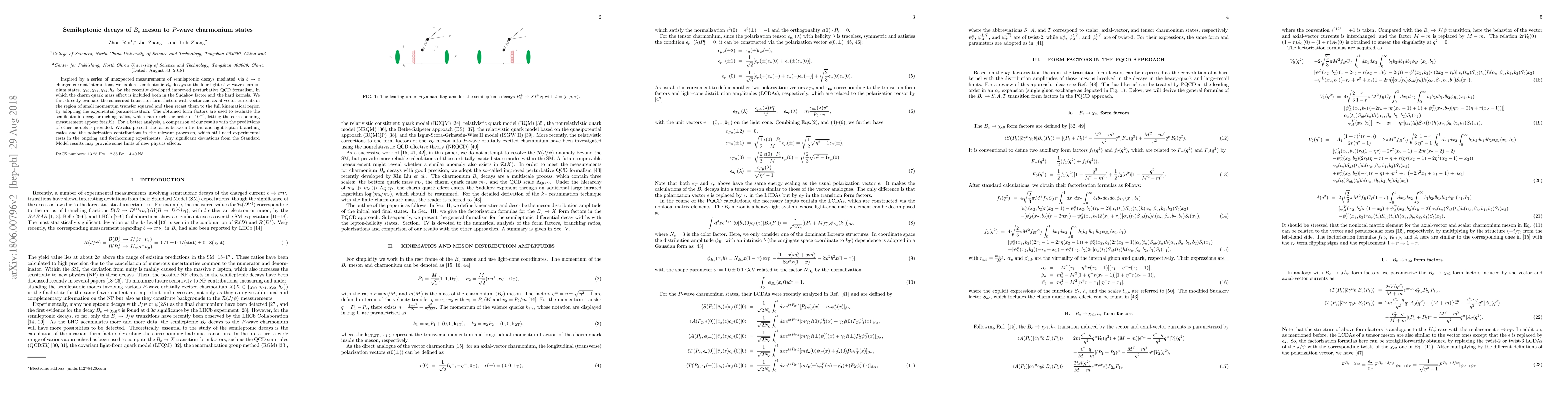 Inspired by a series of unexpected measurements of semileptonic decays mediated via $b\rightarrow c $ charged current interactions, we explore semileptonic $B_c$ decays to the four lightest $P$-wave charmonium states, $\chi_{c0}, \chi_{c1}, \chi_{c2}, h_c$, by the recently developed improved perturbative QCD formalism, in which the charm quark mass effect is included both in the Sudakov factor and the hard kernels. We first directly evaluate the concerned transition form factors with vector and axial-vector currents in the region of small momentum transfer squared, and then recast them to the full kinematical region by adopting the exponential parametrization. The obtained form factors are used to evaluate the semileptonic decay branching ratios, which can reach the order of $10^{-3}$, letting the corresponding measurement appear feasible. For a better analysis, a comparison of our results with the predictions of other models is provided. We also present the ratios between the tau and light lepton branching ratios and the polarization contributions in the relevant processes, which still need experimental tests in the ongoing and forthcoming experiments. Any significant deviations from the Standard Model results may provide some hints of new physics effects.