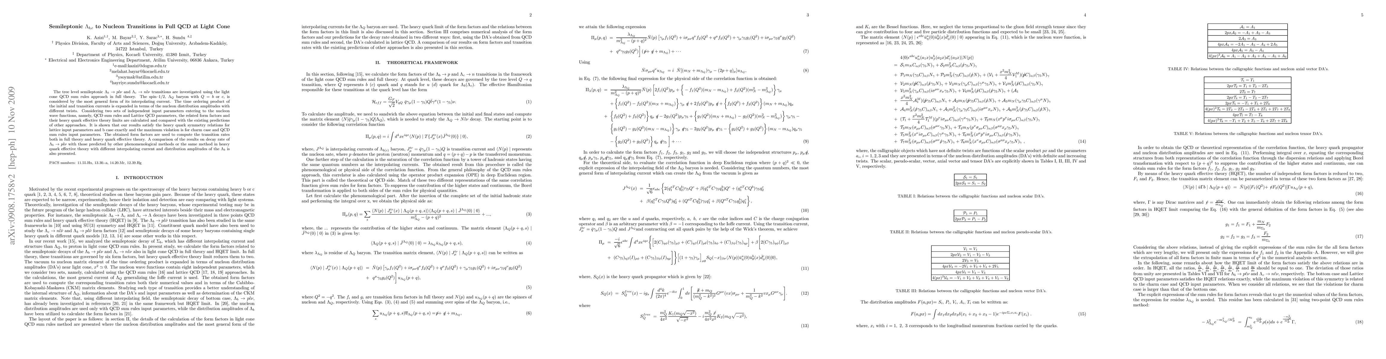 The tree level semileptonic $\Lambda_{b}\to pl\nu$ and $\Lambda_{c}\to nl\nu$ transitions are investigated using the light cone QCD sum rules approach in full theory. The spin--1/2, $\Lambda_{Q}$ baryon with $Q=b$ or $c$, is considered by the most general form of its interpolating current. The time ordering product of the initial and transition currents is expanded in terms of the nucleon distribution amplitudes with different twists. Considering two sets of independent input parameters entering to the nucleon wave functions, namely, QCD sum rules and Lattice QCD parameters, the related form factors and their heavy quark effective theory limits are calculated and compared with the existing predictions of other approaches. It is shown that our results satisfy the heavy quark symmetry relations for lattice input parameters and b case exactly and the maximum violation is for charm case and QCD sum rules input parameters. The obtained form factors are used to compute the transition rates both in full theory and heavy quark effective theory. A comparison of the results on decay rate of $\Lambda_{b}\to pl\nu$ with those predicted by other phenomenological methods or the same method in heavy quark effective theory with different interpolating current and distribution amplitudes of the $\Lambda_{b}$ is also presented.