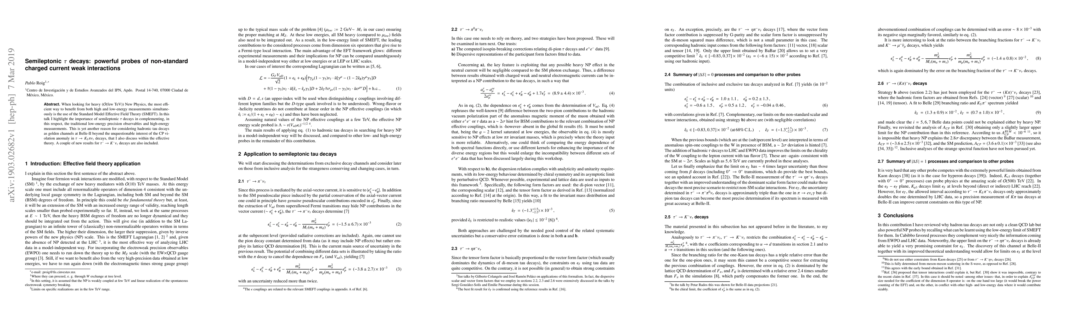 When looking for heavy ($\mathcal{O}$(few TeV)) New Physics, the most efficient way to benefit from both high and low-energy measurements simultaneously is the use of the Standard Model Effective Field Theory (SMEFT). In this talk I highlight the importance of semileptonic $\tau$ decays in complementing, in this respect, the traditional low-energy precision observables and high-energy measurements. This is yet another reason for considering hadronic tau decays as golden channels at Belle-II beyond the unquestionable interest of the CP violation anomaly in $\tau\to K_S\pi\nu_\tau$ decays, that I also discuss within the effective theory. A couple of new results for $\tau^-\to K^-\nu_\tau$ decays are also included.