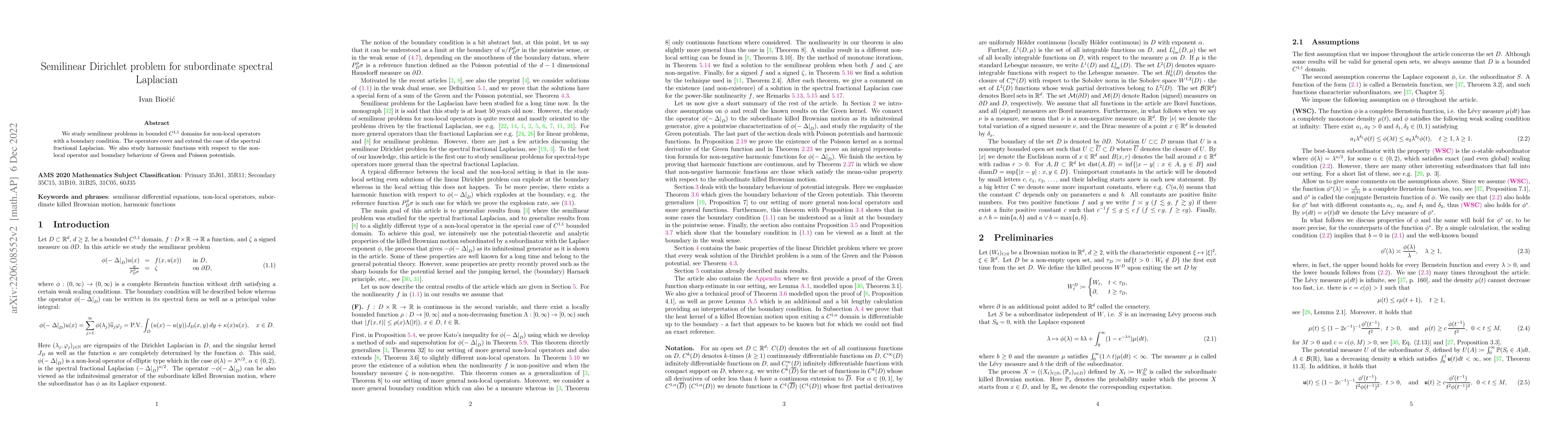 This paper investigates semilinear problems in smooth bounded domains for non-local operators, including the spectral fractional Laplacian, and examines harmonic functions and boundary behaviors of Green and Poisson potentials related to these operators.