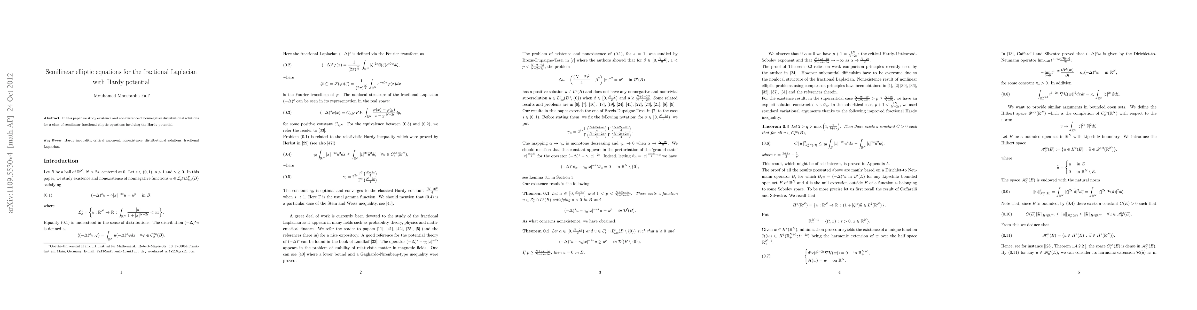 Summary: This paper investigates the existence and nonexistence of nonnegative distributional solutions for semilinear fractional elliptic equations that incorporate the Hardy potential. The focus is on the mathematical analysis of these equations.