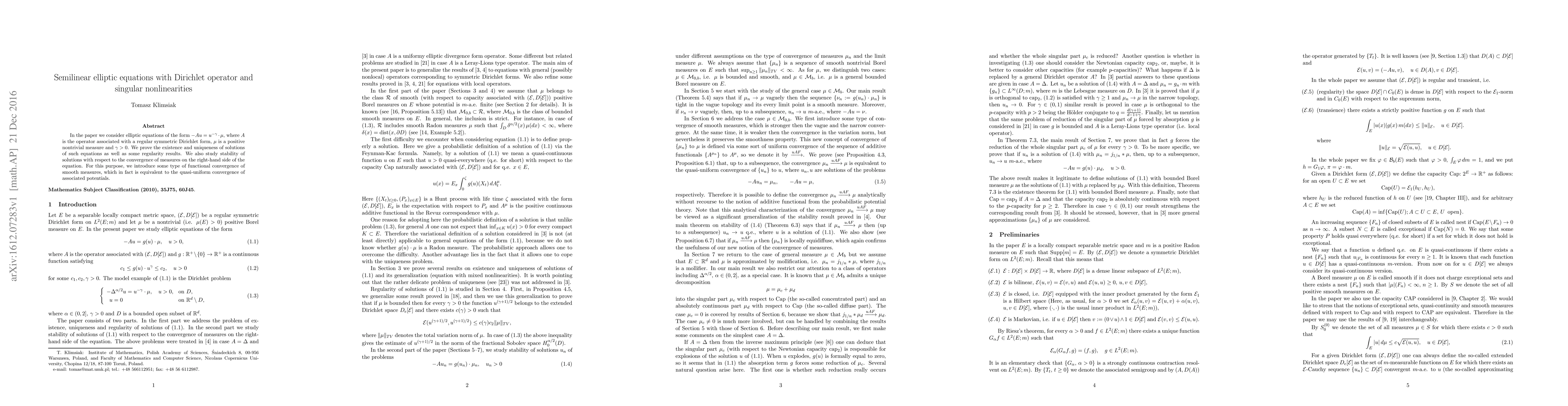This research proves existence, uniqueness, and regularity for solutions of semilinear elliptic equations involving a Dirichlet operator and singular nonlinearities. It also introduces a functional convergence concept for smooth measures, equivalent to quasi-uniform convergence of potentials, to study solution stability concerning measure convergence on the right-hand side of the equation.