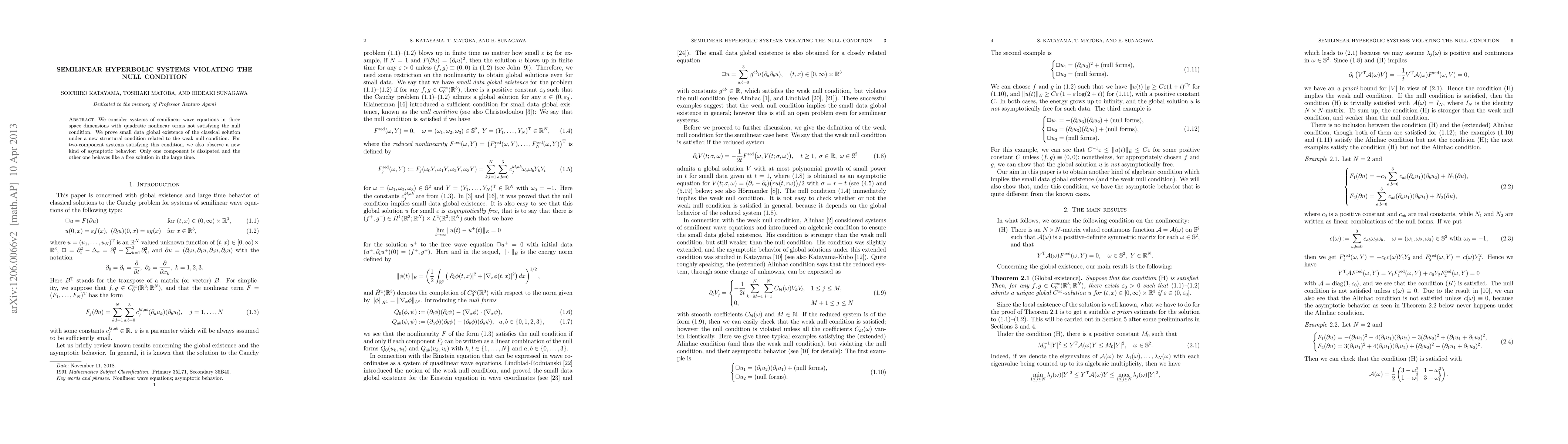 This paper proves small data global existence for semilinear hyperbolic systems of wave equations with quadratic nonlinearities that violate the null condition. It introduces a new structural condition related to the weak null condition and observes unique asymptotic behavior where only one component dissipates while the other behaves independently.