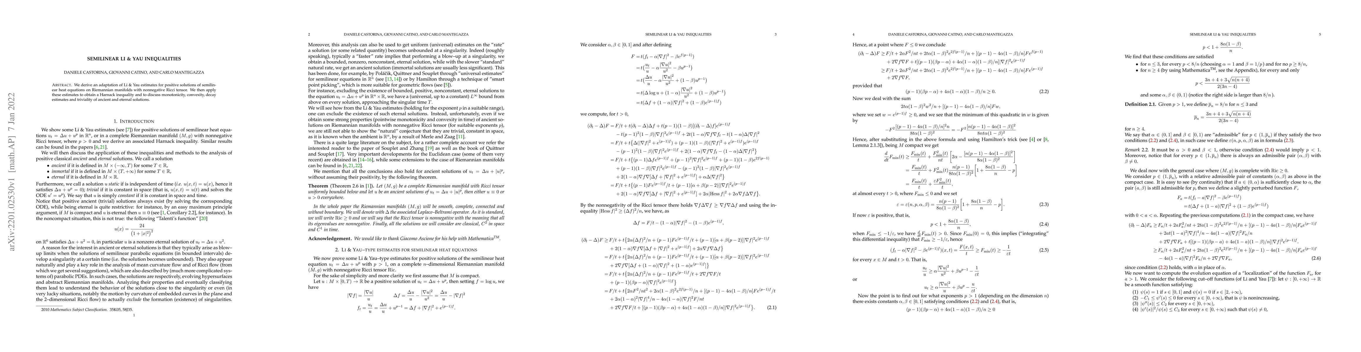 We derive an adaptation of Li & Yau estimates for positive solutions of semilinear heat equations on Riemannian manifolds with nonnegative Ricci tensor. We then apply these estimates to obtain a Harnack inequality and to discuss monotonicity, convexity, decay estimates and triviality of ancient and eternal solutions.