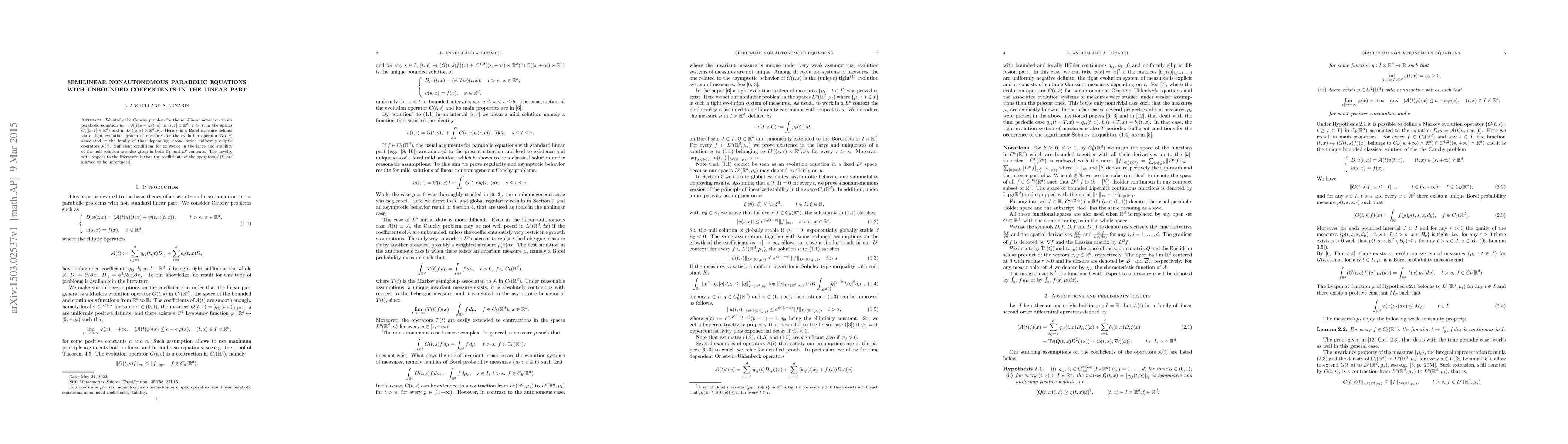 This paper investigates the existence and stability of solutions for a semilinear nonautonomous parabolic equation with unbounded coefficients in $C_b$ and $L^p$ spaces, providing sufficient conditions for the null solution's existence and stability in these contexts. The study allows for the coefficients of the time-dependent elliptic operators to be unbounded, differing from prior literature.