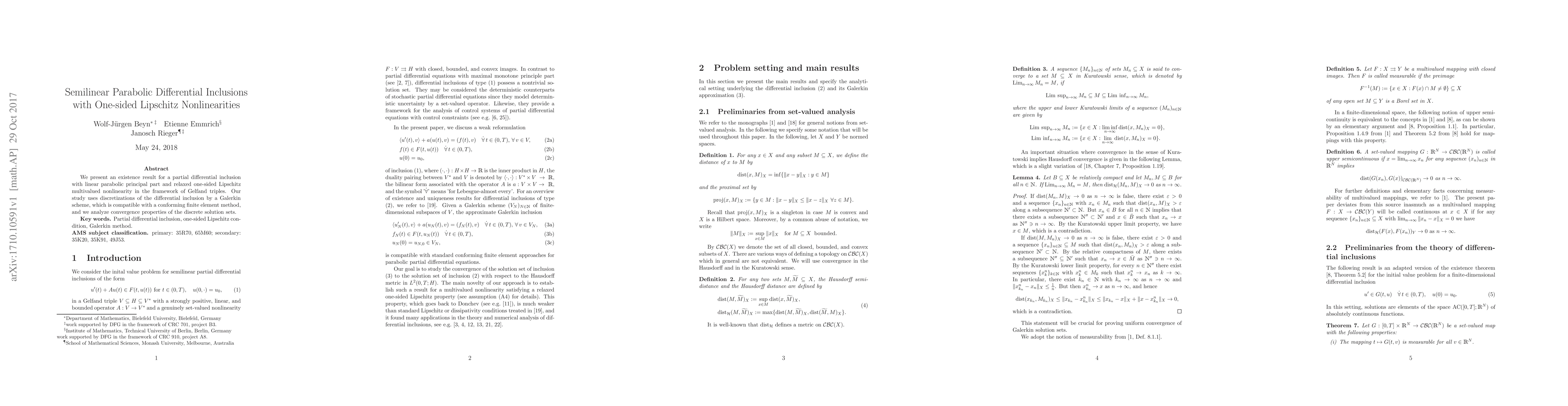 This paper establishes the existence of solutions for semilinear parabolic differential inclusions featuring one-sided Lipschitz multivalued nonlinearities, utilizing a Galerkin scheme compatible with conforming finite element methods and analyzing the convergence properties of the discrete solution sets.