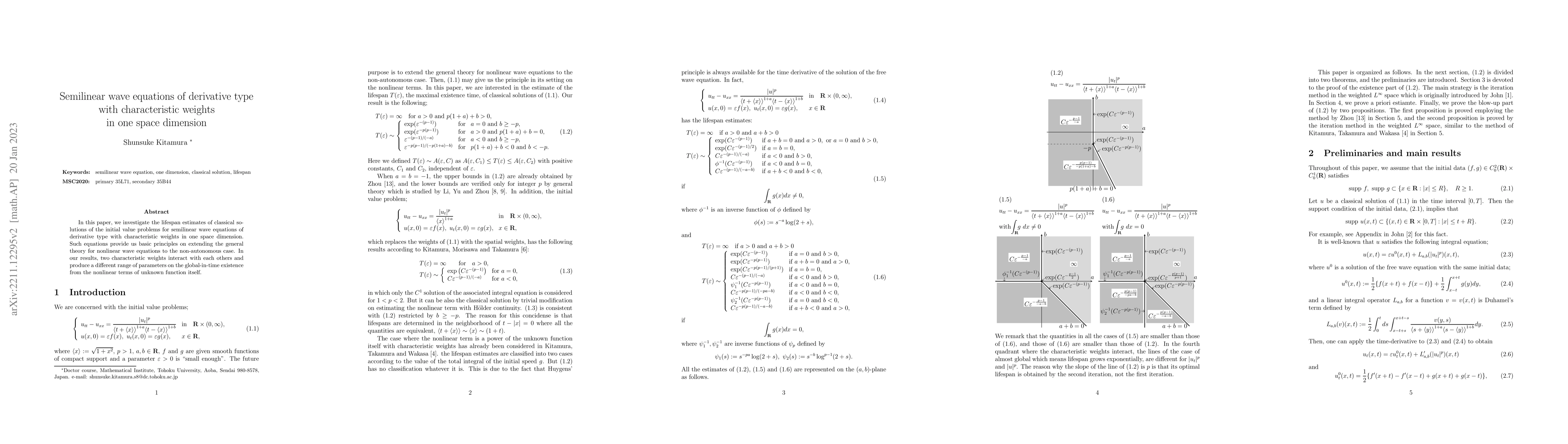 This paper examines the lifespan of classical solutions for semilinear wave equations of derivative type with characteristic weights in one space dimension, focusing on how these weights influence the global-in-time existence of solutions and extend the general theory for nonlinear wave equations to non-autonomous cases.