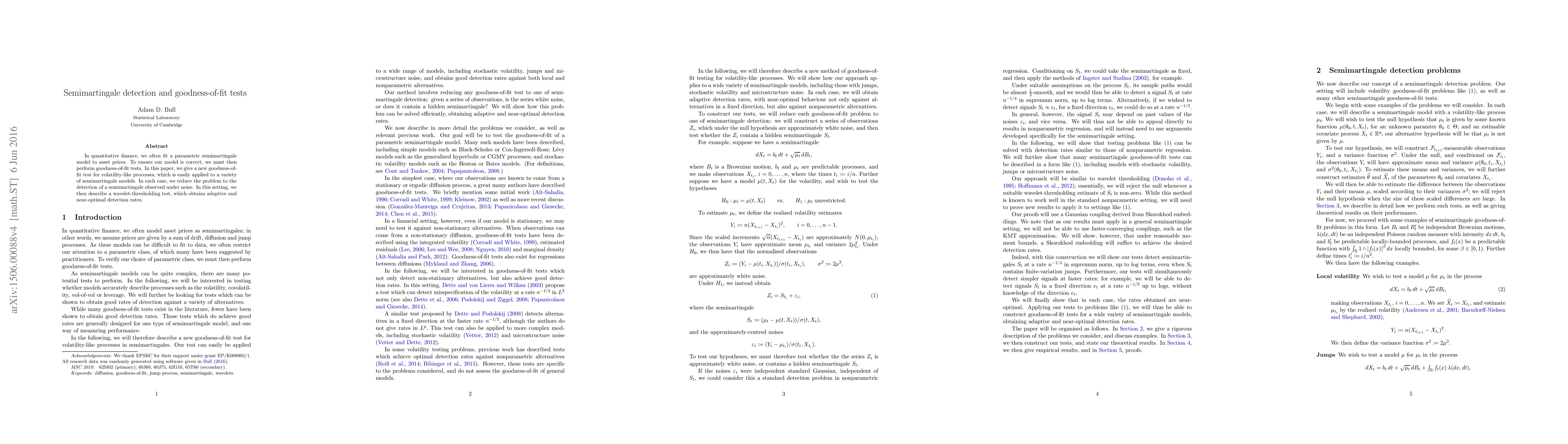 In quantitative finance, we often fit a parametric semimartingale model to asset prices. To ensure our model is correct, we must then perform goodness-of-fit tests. In this paper, we give a new goodness-of-fit test for volatility-like processes, which is easily applied to a variety of semimartingale models. In each case, we reduce the problem to the detection of a semimartingale observed under noise. In this setting, we then describe a wavelet-thresholding test, which obtains adaptive and near-optimal detection rates.