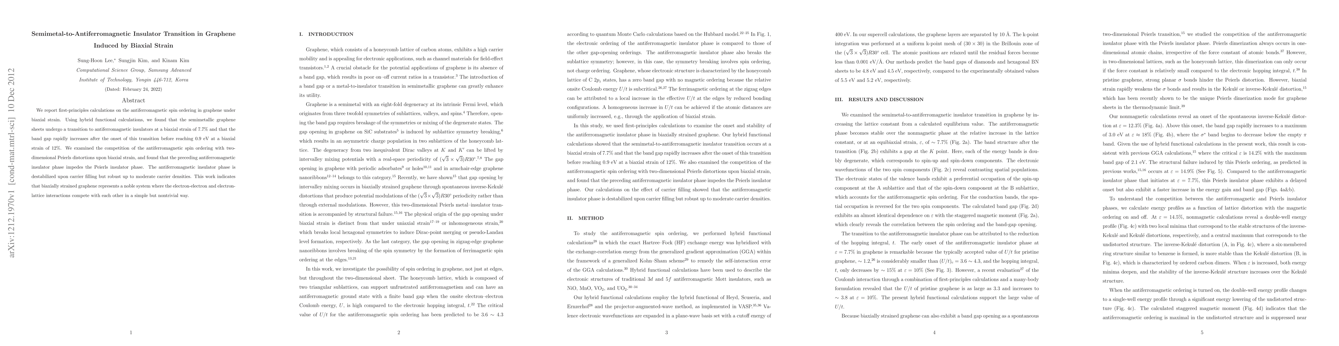 This paper reports that biaxial strain can induce a transition in graphene from a semimetal to an antiferromagnetic insulator, with a band gap increasing to 0.9 eV at 12% strain. The antiferromagnetic phase inhibits Peierls distortions and remains stable under moderate carrier densities.