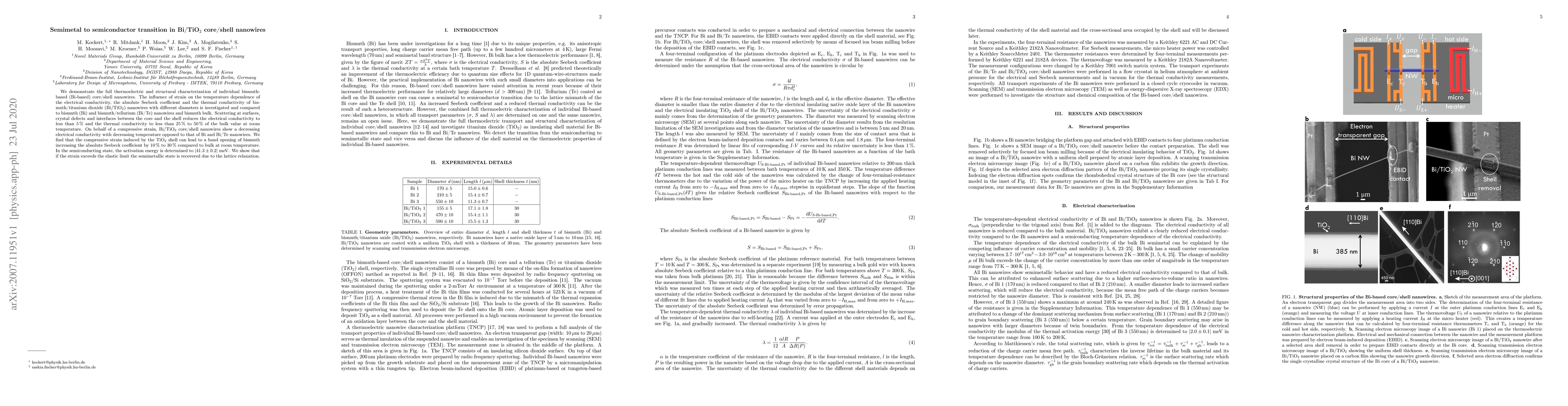 We demonstrate the full thermoelectric and structural characterization of individual bismuth-based (Bi-based) core/shell nanowires. The influence of strain on the temperature dependence of the electrical conductivity, the absolute Seebeck coefficient and the thermal conductivity of bismuth/titanium dioxide ($\text{Bi}/\text{TiO}_{2}$) nanowires with different diameters is investigated and compared to bismuth (Bi) and bismuth/tellurium (Bi/Te) nanowires and bismuth bulk. Scattering at surfaces, crystal defects and interfaces between the core and the shell reduces the electrical conductivity to less than $5\,\%$ and the thermal conductivity to less than $25\,\%$ to $50\,\%$ of the bulk value at room temperature. On behalf of a compressive strain, $\text{Bi}/\text{TiO}_{2}$ core/shell nanowires show a decreasing electrical conductivity with decreasing temperature opposed to that of Bi and Bi/Te nanowires. We find that the compressive strain induced by the $\text{TiO}_{2}$ shell can lead to a band opening of bismuth increasing the absolute Seebeck coefficient by $10\,\%$ to $30\,\%$ compared to bulk at room temperature. In the semiconducting state, the activation energy is determined to $\left|41.3\pm0.2\right|\,\text{meV}$. We show that if the strain exceeds the elastic limit the semimetallic state is recovered due to the lattice relaxation.