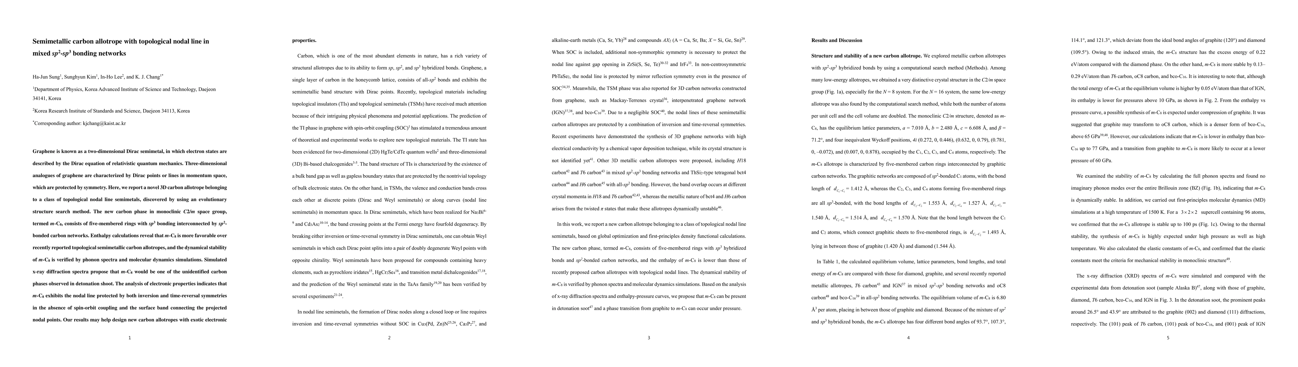 Researchers discovered a novel 3D carbon allotrope, termed $m$-$C_8$, characterized by topological nodal lines in its mixed $sp^2$-$sp^3$ bonding networks. The new allotrope is dynamically stable and more energetically favorable than other known topological semimetals.