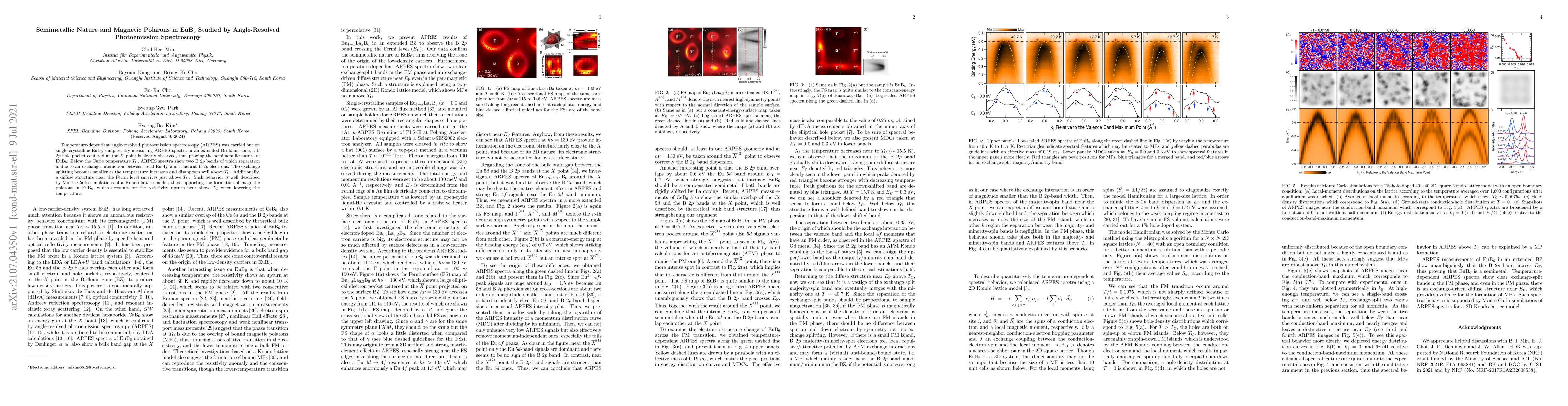 This study uses angle-resolved photoemission spectroscopy to demonstrate the semimetallic nature of EuB6, revealing a B 2p hole pocket. Below the Curie temperature, exchange splitting of B 2p bands indicates the formation of magnetic polarons, supported by Monte Carlo simulations.