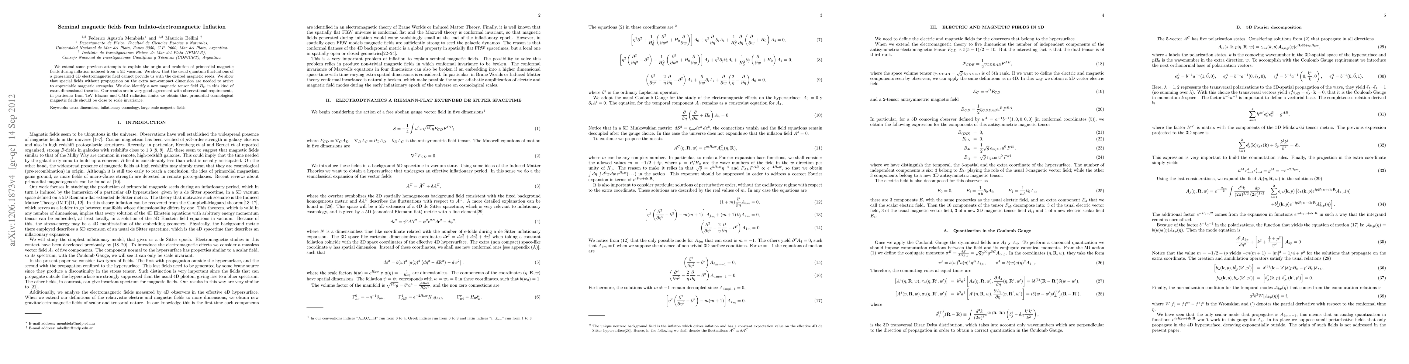 We extend some previous attempts to explain the origin and evolution of primordial magnetic fields during inflation induced from a 5D vacuum. We show that the usual quantum fluctuations of a generalized 5D electromagnetic field cannot provide us with the desired magnetic seeds. We show that special fields without propagation on the extra non-compact dimension are needed to arrive to appreciable magnetic strengths. We also identify a new magnetic tensor field $B_{ij}$ in this kind of extra dimensional theories. Our results are in very good agreement with observational requirements, in particular from TeV Blazars and CMB radiation limits we obtain that primordial cosmological magnetic fields should be close scale invariance.