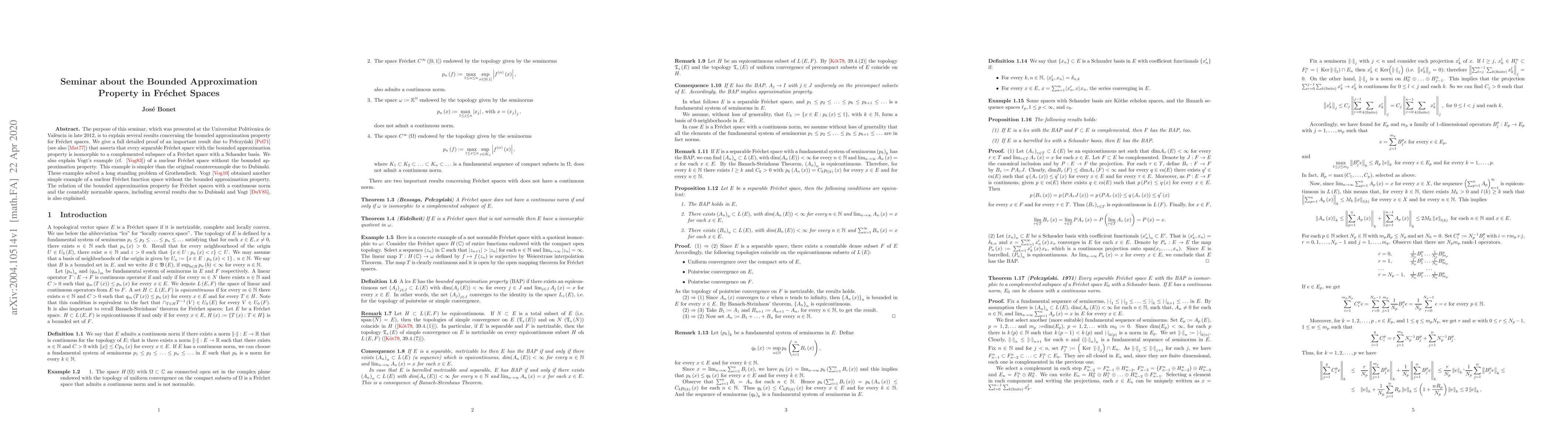 This seminar elucidates results on the bounded approximation property in Fréchet spaces, proving Pełczynski's theorem that separable spaces with this property are isomorphic to complemented subspaces of spaces with a Schauder basis. It also presents Vogt's simpler counterexample to Grothendieck's problem regarding nuclear Fréchet spaces lacking this property.