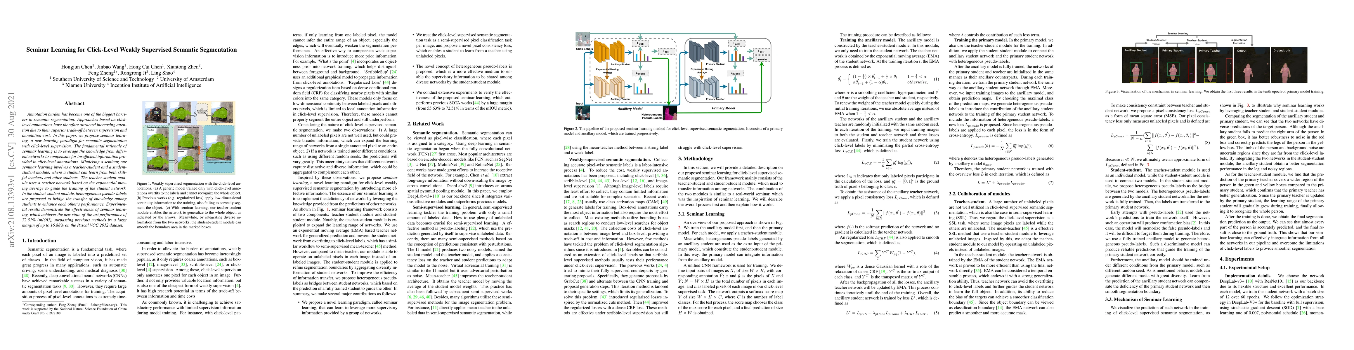 This paper introduces seminar learning, a novel paradigm for click-level weakly supervised semantic segmentation, which leverages knowledge from multiple networks to compensate for sparse annotations. The approach achieves state-of-the-art results with 72.51% mIOU on Pascal VOC 2012, outperforming previous methods by 16.88%.