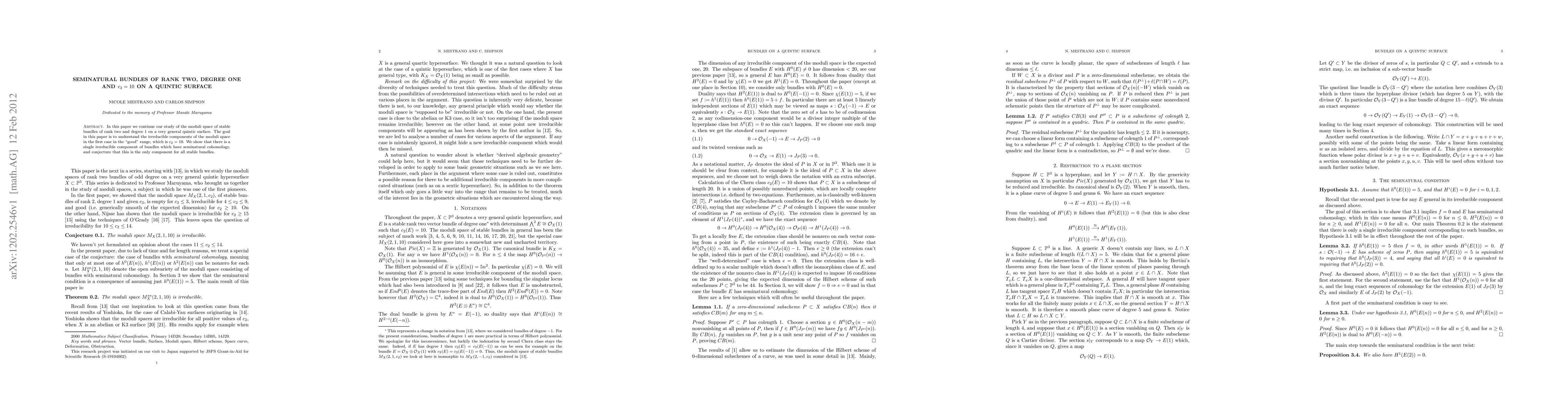 This paper explores the moduli space of rank two, degree one bundles on a quintic surface, focusing on the case where $c_2=10$. It identifies a single irreducible component of these bundles characterized by seminatural cohomology, and proposes this component may represent the entirety of stable bundles in this "good" range.