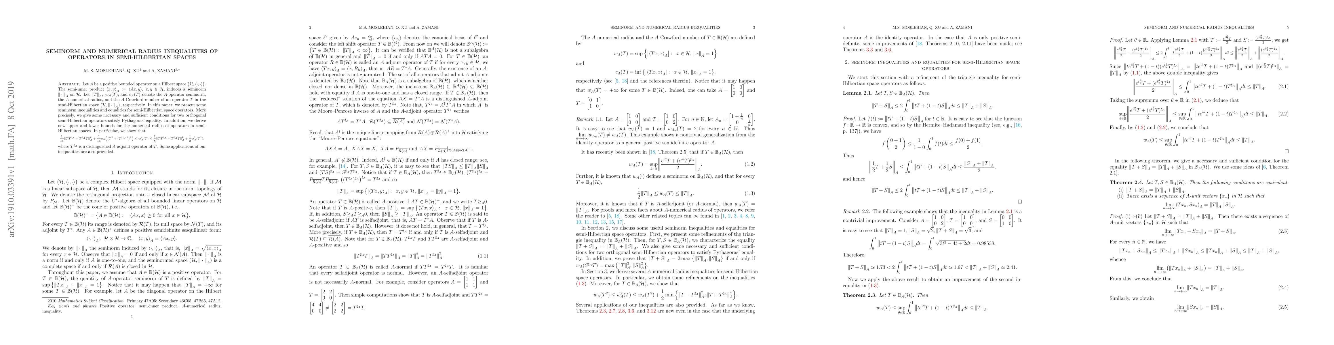 This paper investigates seminorm and numerical radius inequalities for operators in semi-Hilbertian spaces. It provides conditions for orthogonal semi-Hilbertian operators to satisfy Pythagoras' equality and derives new bounds for the numerical radius involving the distinguished $A$-adjoint operator.
