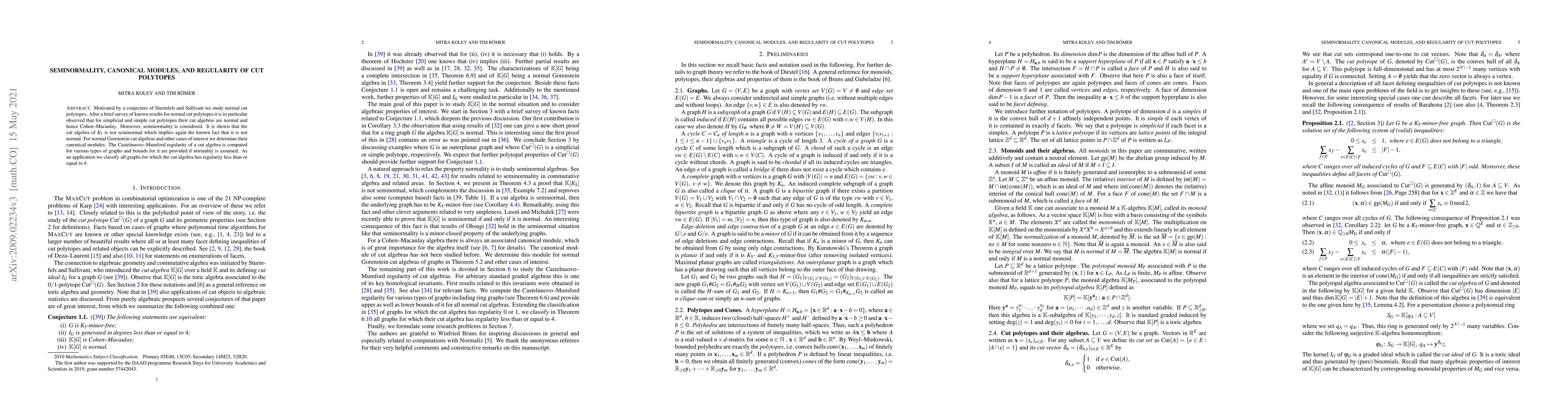 Motivated by a conjecture of Sturmfels and Sullivant we study normal cut polytopes. After a brief survey of known results for normal cut polytopes it is in particular observed that for simplicial and simple cut polytopes their cut algebras are normal and hence Cohen--Macaulay. Moreover, seminormality is considered. It is shown that the cut algebra of $K_5$ is not seminormal which implies again the known fact that it is not normal. For normal Gorenstein cut algebras and other cases of interest we determine their canonical modules. The Castelnuovo-Mumford regularity of a cut algebra is computed for various types of graphs and bounds for it are provided if normality is assumed. As an application we classify all graphs for which the cut algebra has regularity less than or equal to 4.