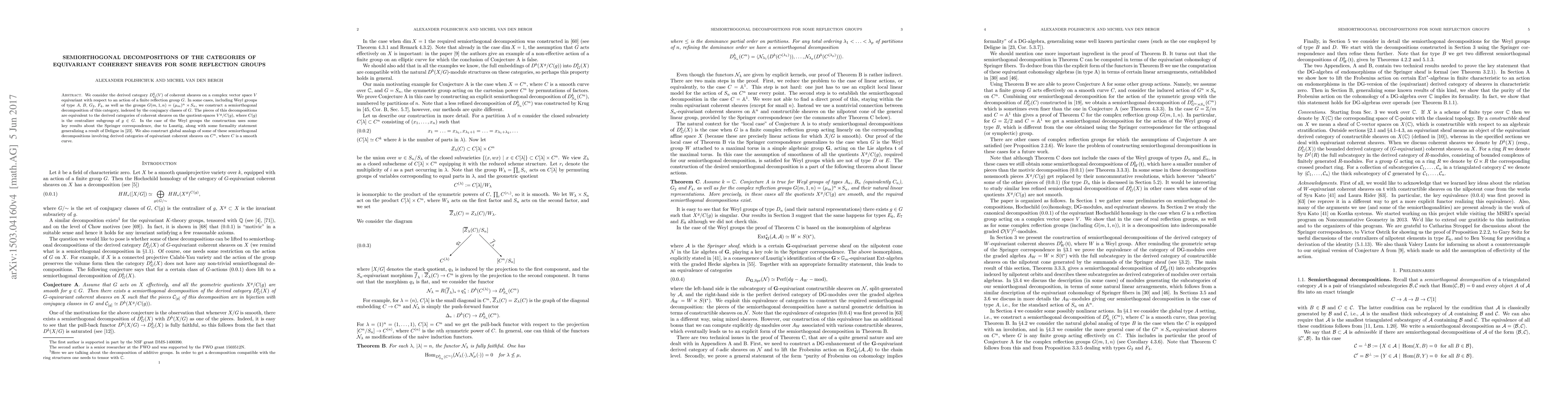 We consider the derived category of coherent sheaves on a complex vector space equivariant with respect to an action of a finite reflection group G. In some cases, including Weyl groups of type A, B, G_2, F_4, as well as the groups G(m,1,n), we construct a semiorthogonal decomposition of this category, indexed by the conjugacy classes of G. The pieces of this decompositions are equivalent to the derived categories of coherent sheaves on the quotient-spaces V^g/C(g), where C(g) is the centralizer subgroup of g in G. In the case of the Weyl groups the construction uses some key results about the Springer correspondence, due to Lusztig, along with some formality statement generalizing a result of Deligne. We also construct global analogs of some of these semiorthogonal decompositions involving derived categories of equivariant coherent sheaves on C^n, where C is a smooth curve.