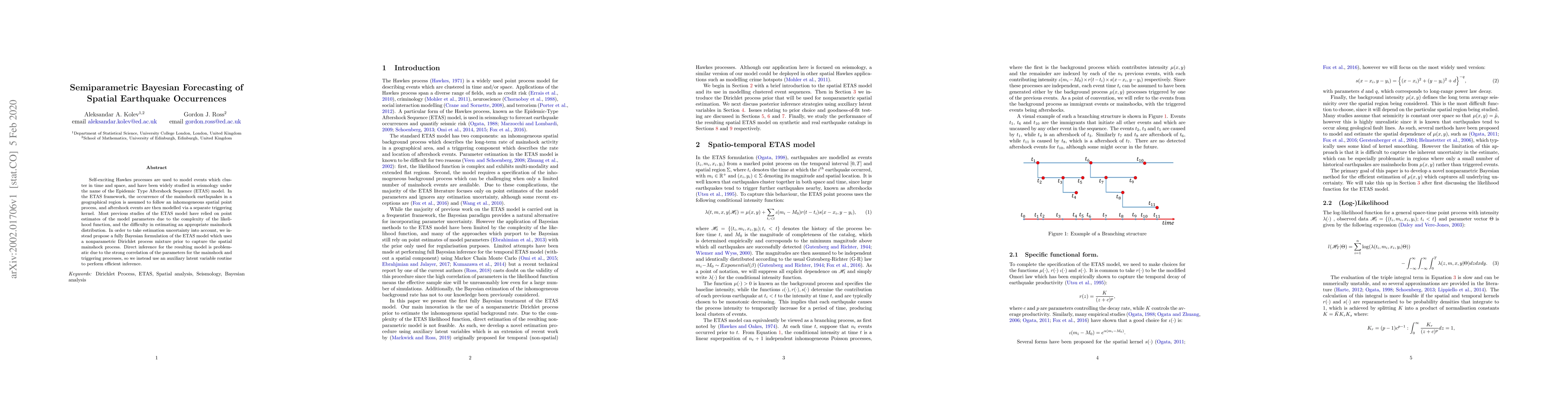 Self-exciting Hawkes processes are used to model events which cluster in time and space, and have been widely studied in seismology under the name of the Epidemic Type Aftershock Sequence (ETAS) model. In the ETAS framework, the occurrence of the mainshock earthquakes in a geographical region is assumed to follow an inhomogeneous spatial point process, and aftershock events are then modelled via a separate triggering kernel. Most previous studies of the ETAS model have relied on point estimates of the model parameters due to the complexity of the likelihood function, and the difficulty in estimating an appropriate mainshock distribution. In order to take estimation uncertainty into account, we instead propose a fully Bayesian formulation of the ETAS model which uses a nonparametric Dirichlet process mixture prior to capture the spatial mainshock process. Direct inference for the resulting model is problematic due to the strong correlation of the parameters for the mainshock and triggering processes, so we instead use an auxiliary latent variable routine to perform efficient inference.