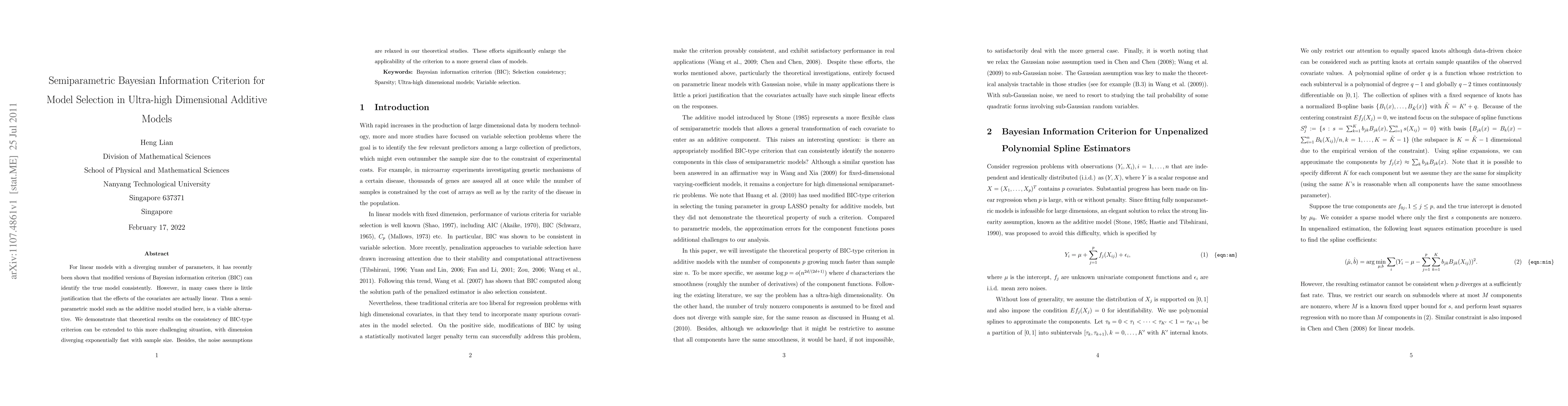 This paper proposes a semiparametric Bayesian information criterion (BIC) for selecting models in ultra-high dimensional additive models, extending theoretical consistency results to scenarios where the number of parameters grows exponentially with sample size, and relaxes noise assumptions to enhance applicability.