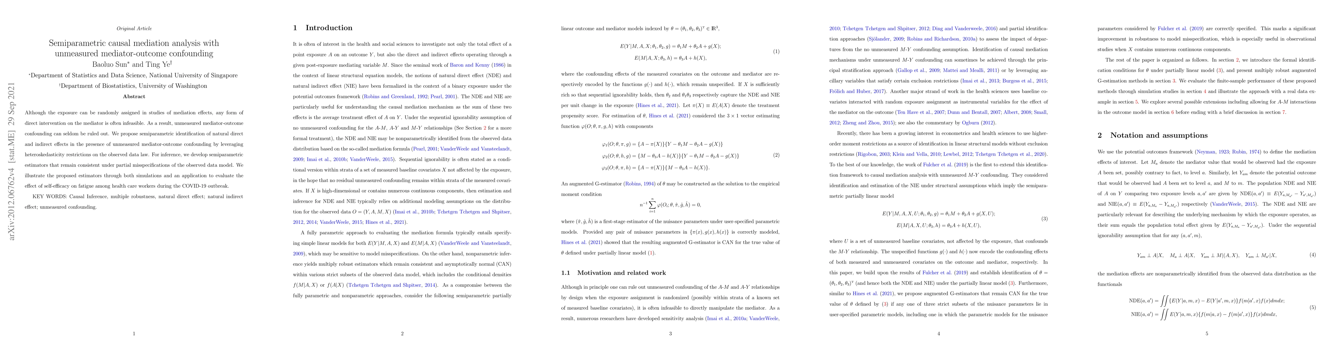 This paper proposes semiparametric methods for causal mediation analysis, addressing unmeasured mediator-outcome confounding through heteroskedasticity restrictions. It develops consistent estimators under partial model misspecification and demonstrates their application in evaluating the effect of self-efficacy on fatigue among healthcare workers during COVID-19.