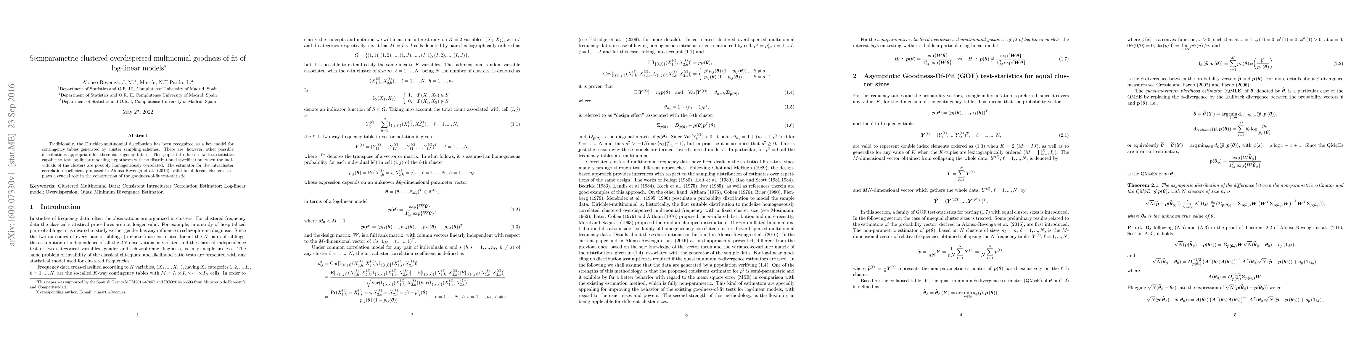 This paper proposes new test-statistics for assessing log-linear models in clustered overdispersed multinomial data, without requiring specific distributional assumptions, utilizing an estimator for intracluster correlation from Alonso-Revenga et al. (2016). The approach is valid for different cluster sizes and aims to improve goodness-of-fit testing.