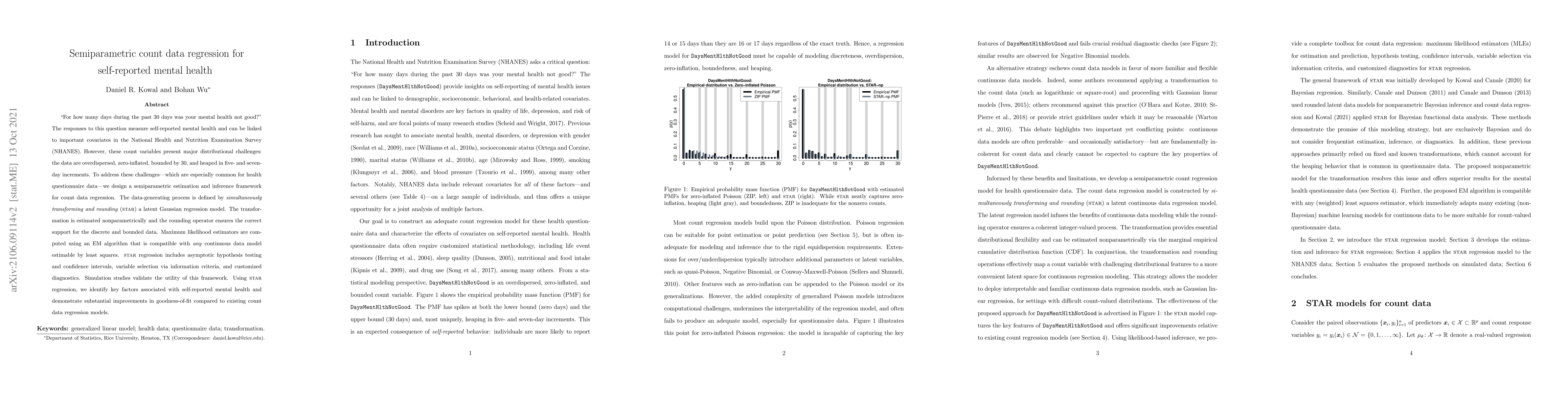 This paper proposes a semiparametric STAR regression framework for analyzing overdispersed, zero-inflated count data, specifically for self-reported mental health measures from NHANES. The method combines nonparametric transformation and rounding to handle the unique distributional challenges, showing improved fit and performance over traditional models.