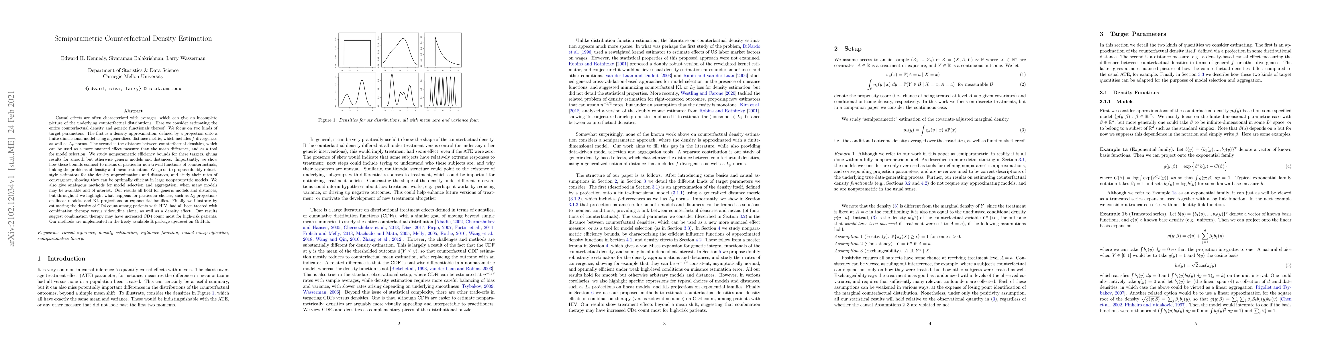 Causal effects are often characterized with averages, which can give an incomplete picture of the underlying counterfactual distributions. Here we consider estimating the entire counterfactual density and generic functionals thereof. We focus on two kinds of target parameters. The first is a density approximation, defined by a projection onto a finite-dimensional model using a generalized distance metric, which includes f-divergences as well as $L_p$ norms. The second is the distance between counterfactual densities, which can be used as a more nuanced effect measure than the mean difference, and as a tool for model selection. We study nonparametric efficiency bounds for these targets, giving results for smooth but otherwise generic models and distances. Importantly, we show how these bounds connect to means of particular non-trivial functions of counterfactuals, linking the problems of density and mean estimation. We go on to propose doubly robust-style estimators for the density approximations and distances, and study their rates of convergence, showing they can be optimally efficient in large nonparametric models. We also give analogous methods for model selection and aggregation, when many models may be available and of interest. Our results all hold for generic models and distances, but throughout we highlight what happens for particular choices, such as $L_2$ projections on linear models, and KL projections on exponential families. Finally we illustrate by estimating the density of CD4 count among patients with HIV, had all been treated with combination therapy versus zidovudine alone, as well as a density effect. Our results suggest combination therapy may have increased CD4 count most for high-risk patients. Our methods are implemented in the freely available R package npcausal on GitHub.